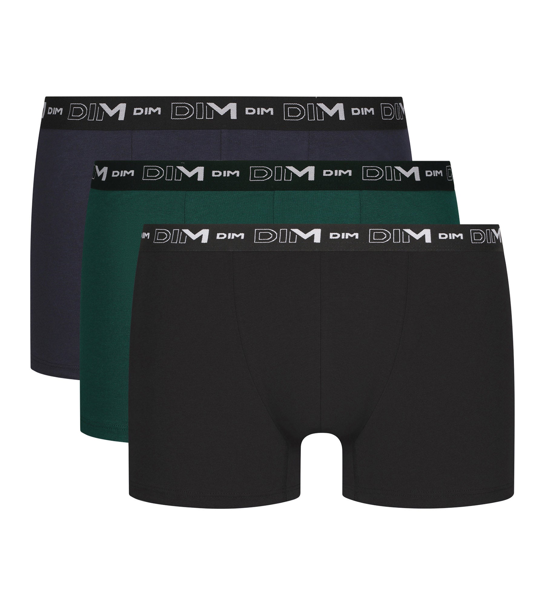 Affirmez votre style avec le lot de 3 boxers pour homme Dim Coton Stretch en noir, vert et denim, et à la ceinture graphique !