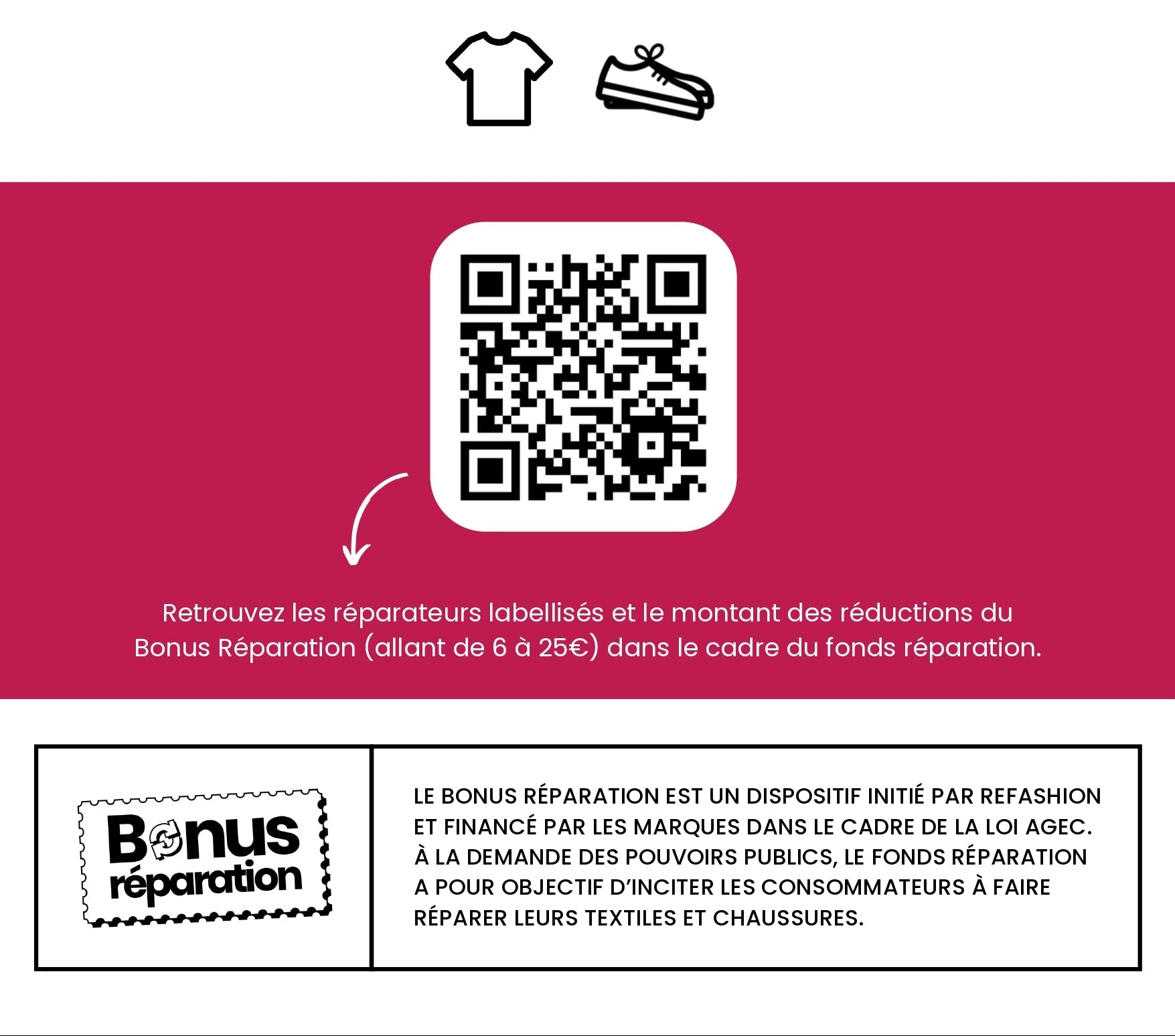 Bonus Réparation pour les vêtements et chaussures mais également la lingerie.