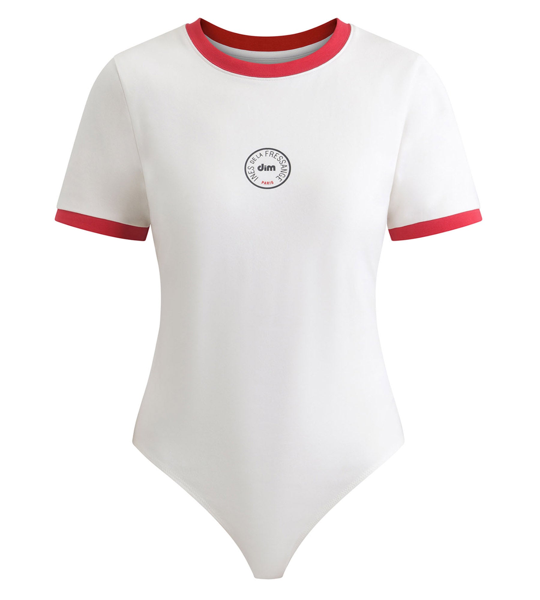 Adoptez un style sport chic avec le body femme Nacre Dim x Ines de La Fressange, twisté par un col rouge contrasté.