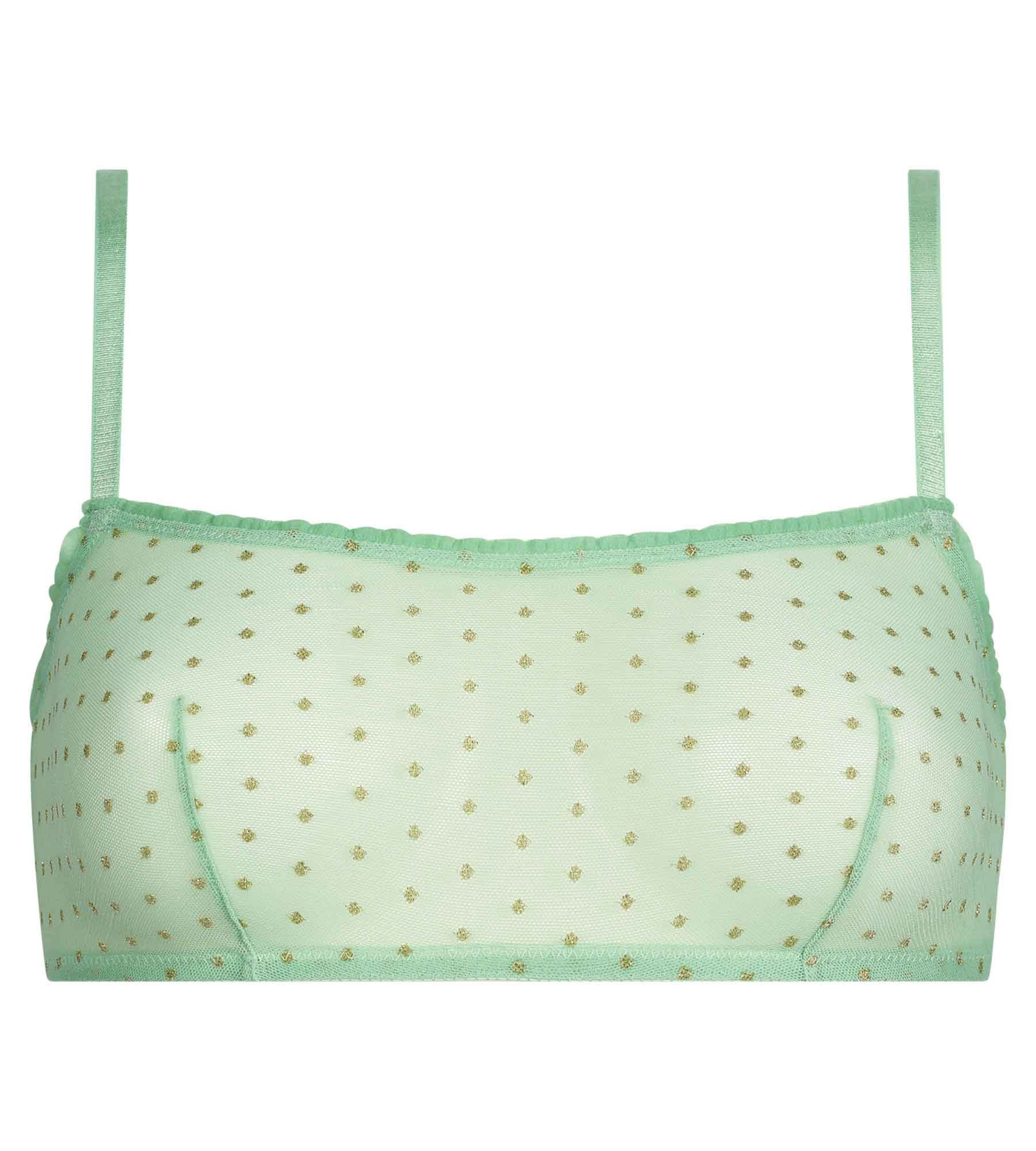 Craquez pour le design précieux et acidulé de la brassière femme en tulle transparent Vert d’Eau Shiny Mesh à pois scintillants !