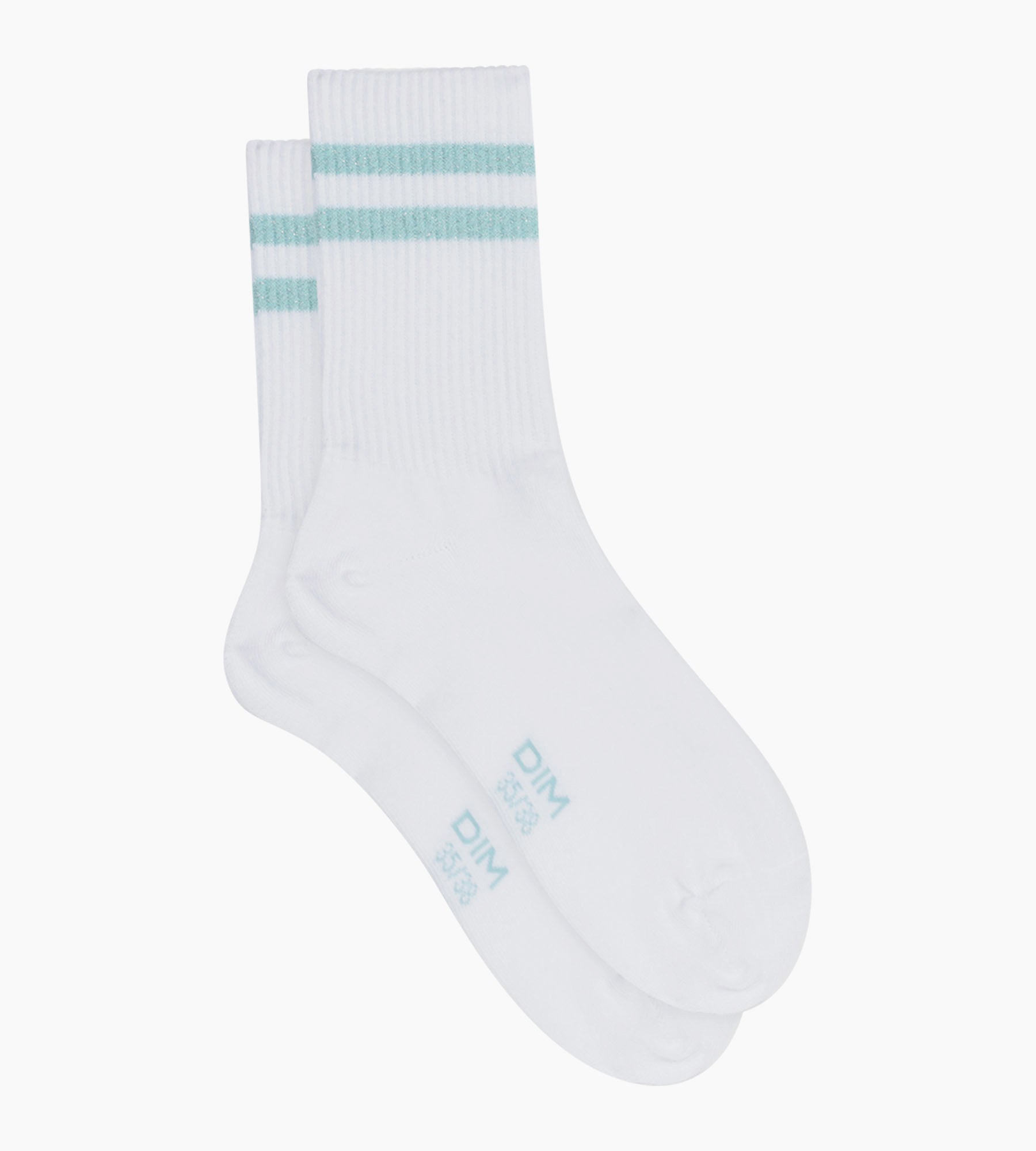 La chaussette femme en coton blanc Dim Mode s’anime de fines bandes lurex bleues pour un look sportif à la touche féminine.