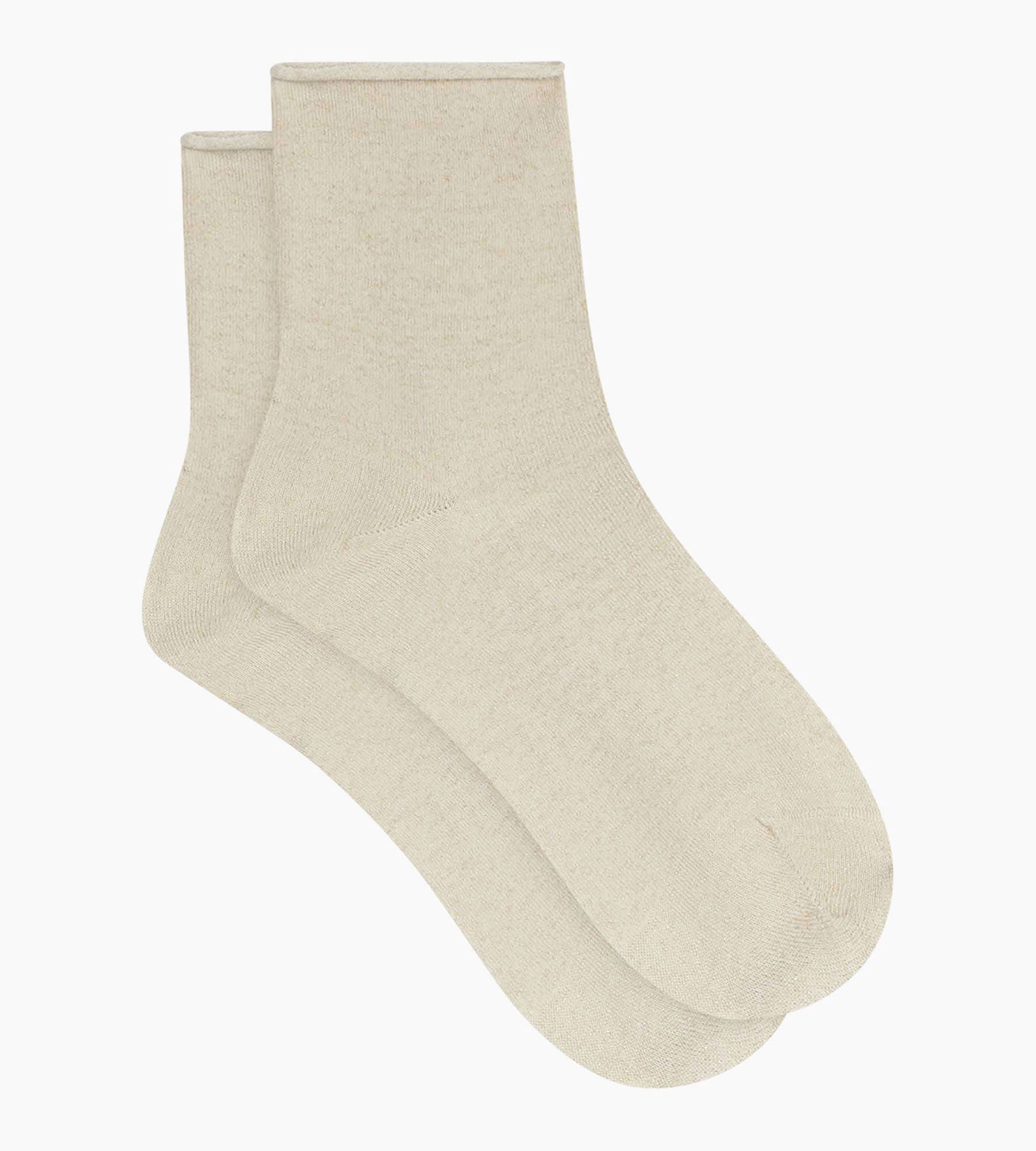 La chaussette femme Dim Mode en lurex Beige mise sur une matière douce légèrement irisée pour revisiter un essentiel du vestiaire.