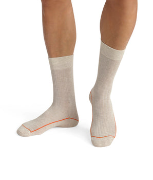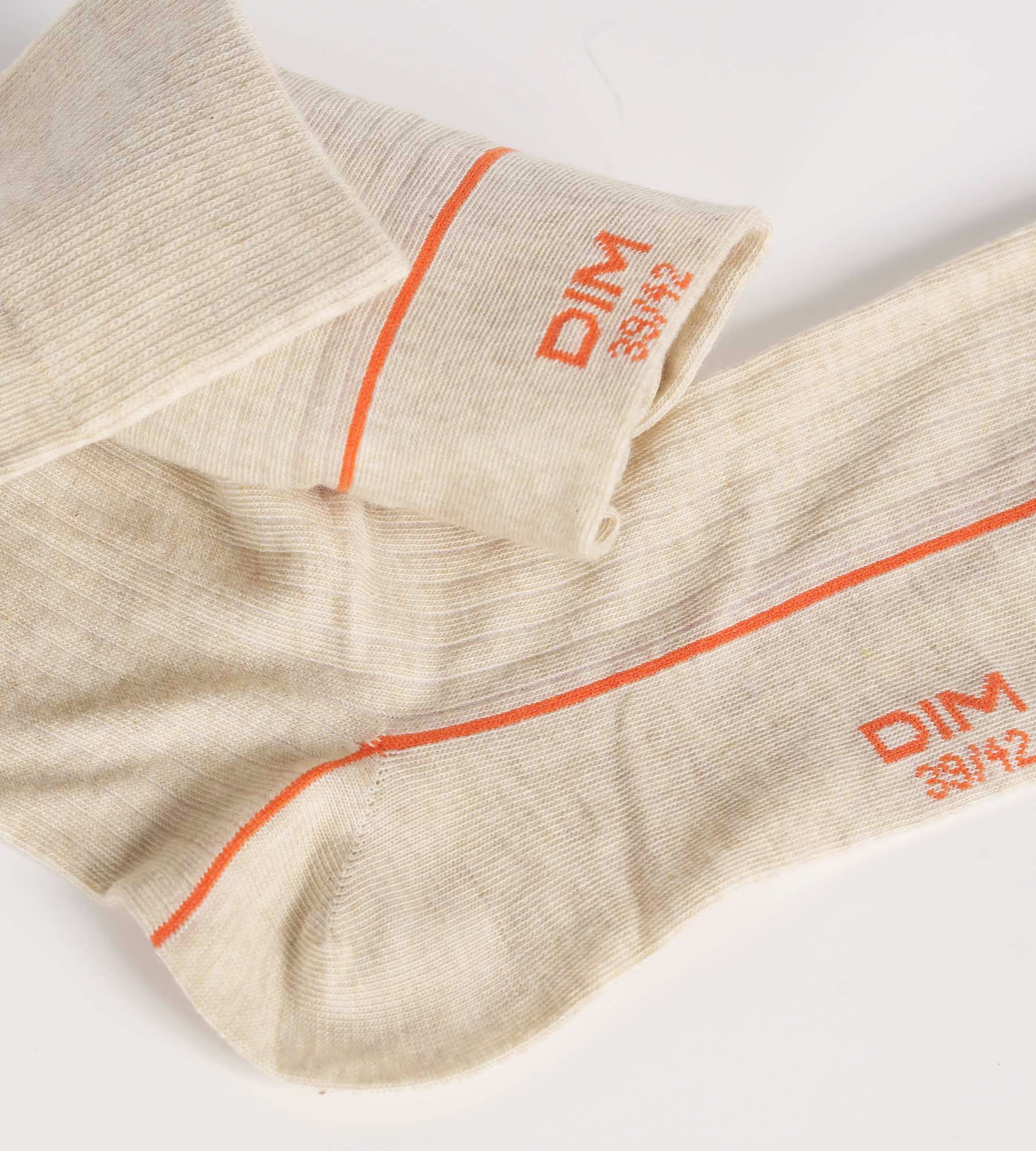 Optez pour une allure naturelle et lumineuse avec la paire de chaussettes homme Dim Mode en coton côtelé Beige Chiné et liseré Orange !