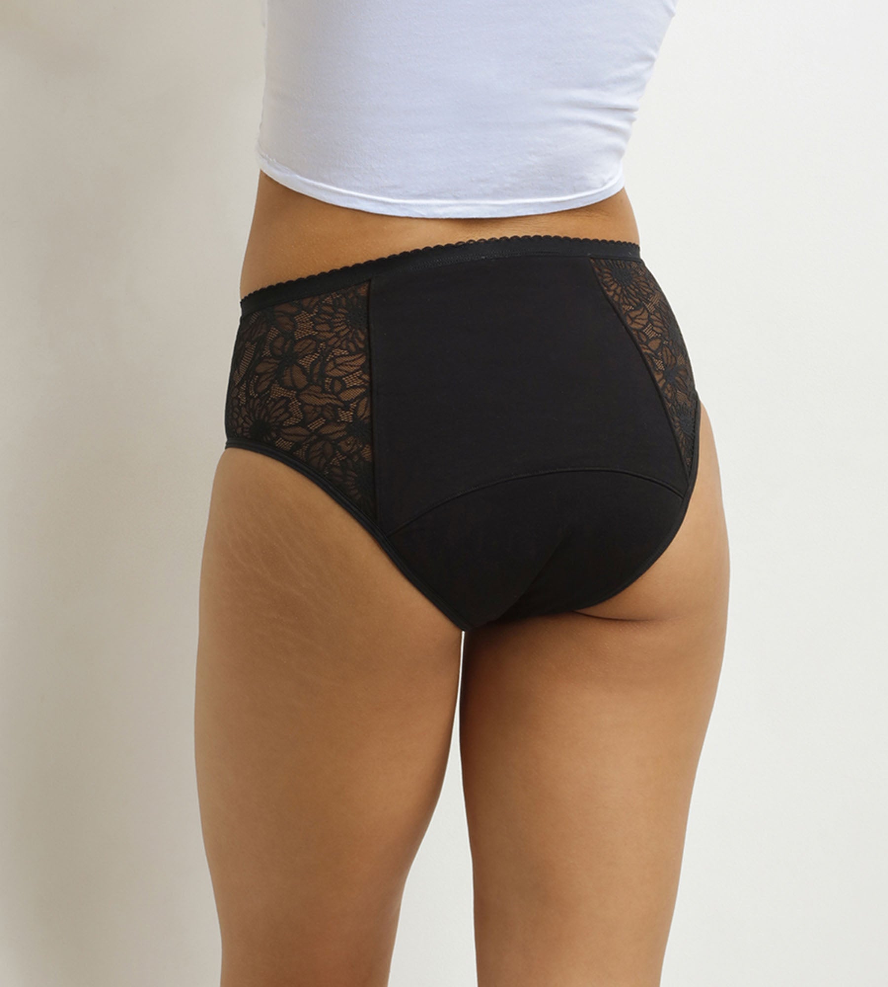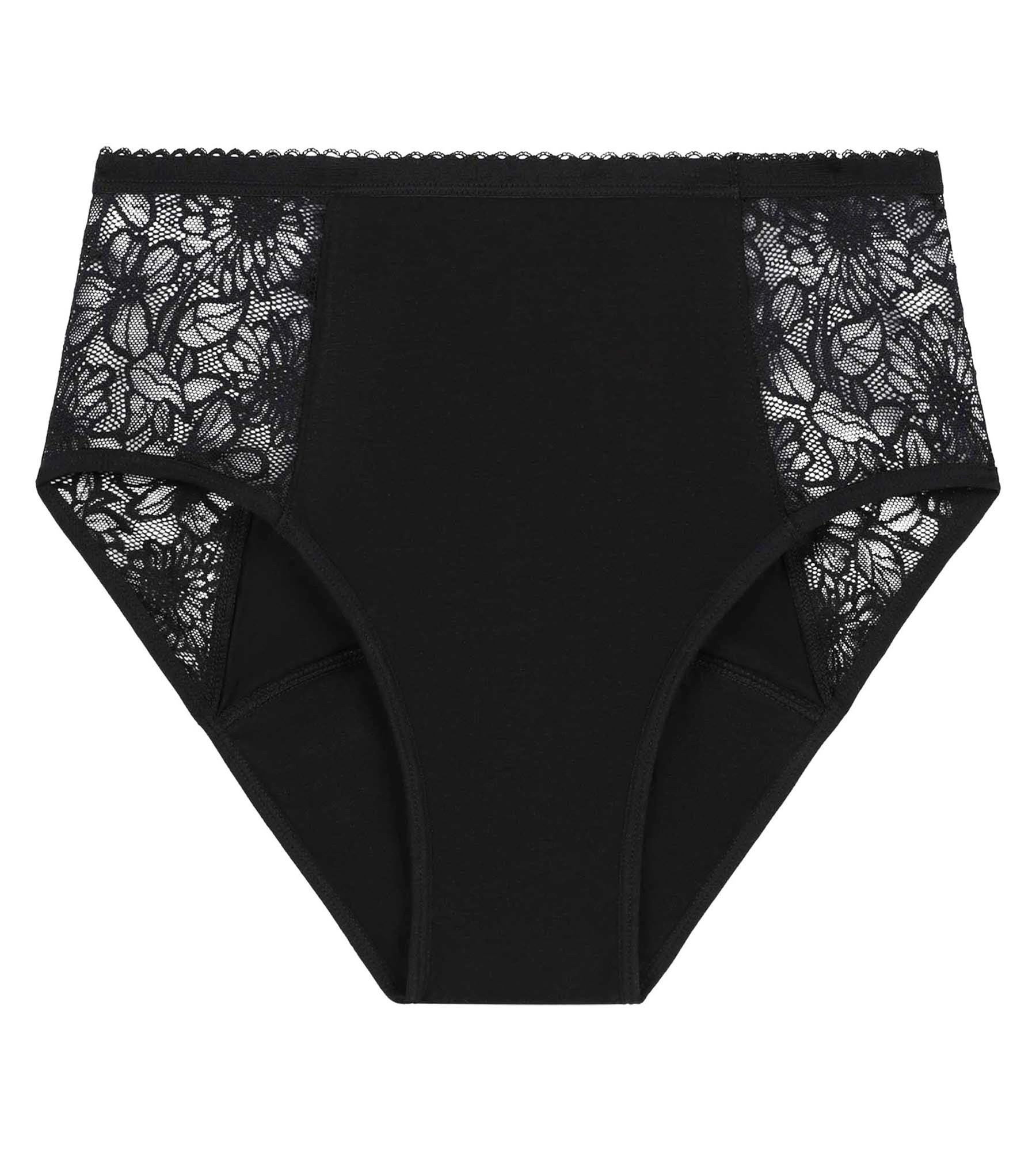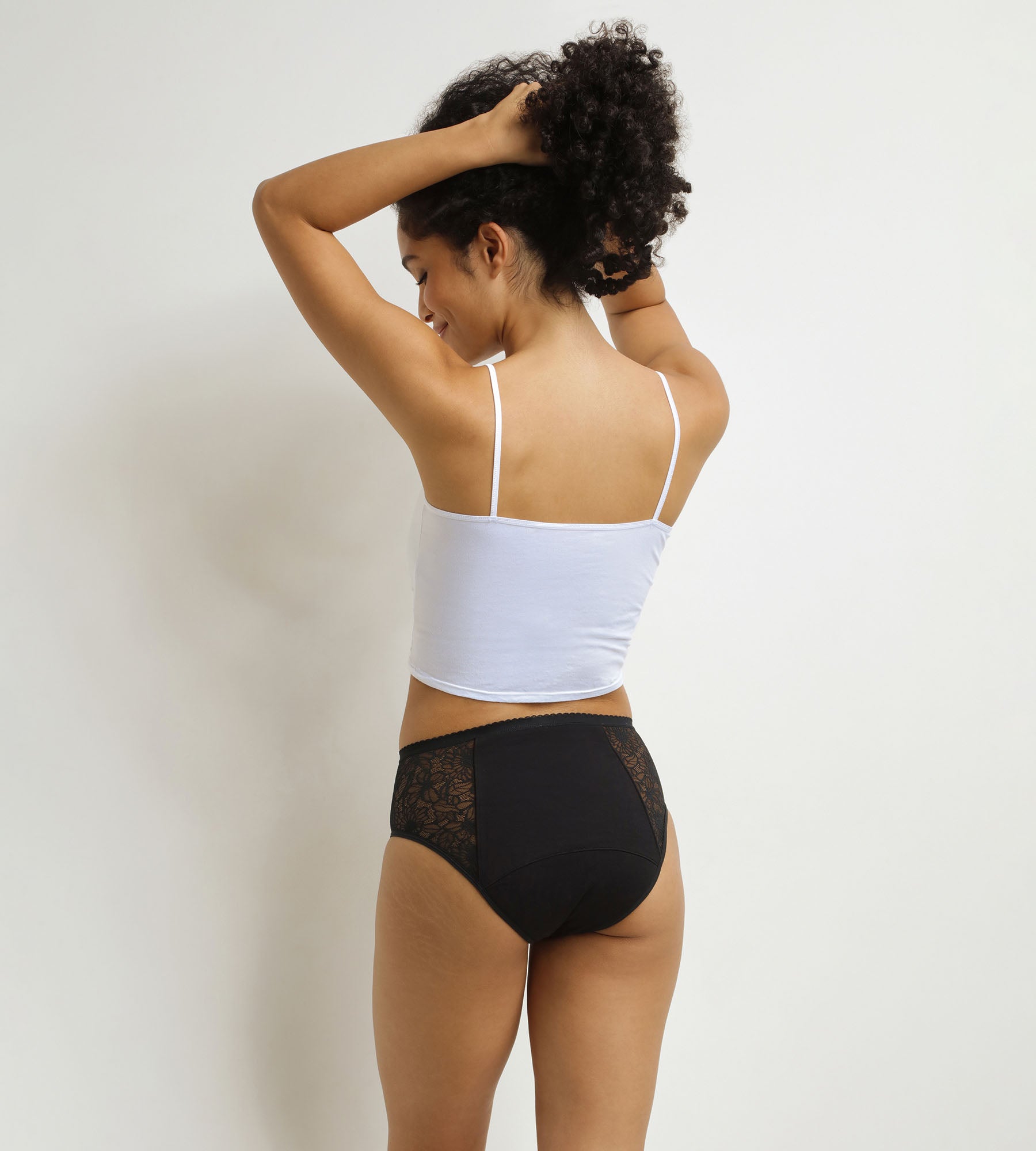Adoptez la culotte menstruelle Dim Protect en coton bio et dentelle florale noire : une protection fiable et féminine pour les flux très abondants.