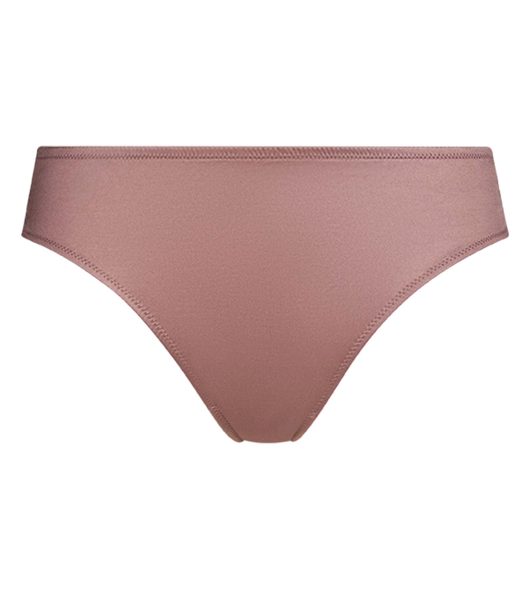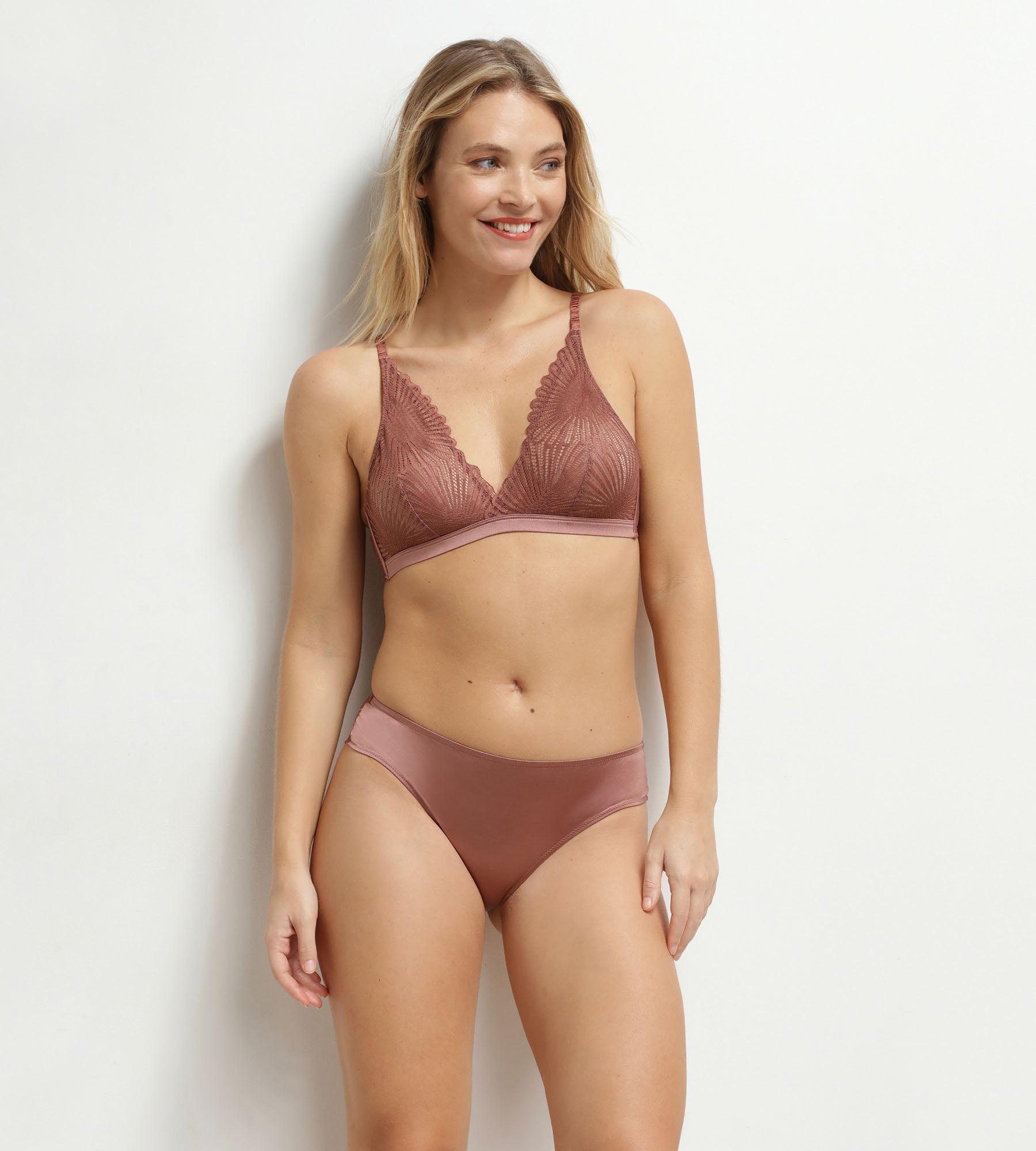 Alliance de douceur et de transparence, la culotte en dentelle Dim Chocolove et satin marron marie confort soyeux et sensualité discrète.