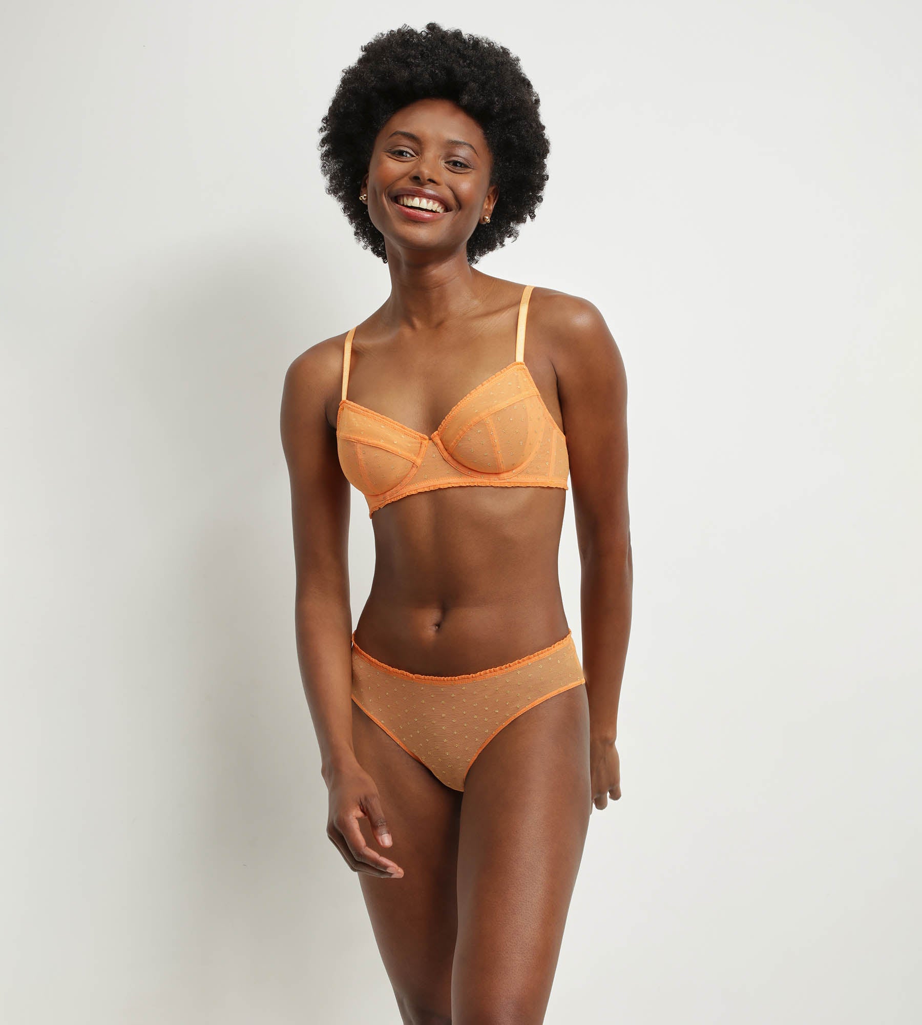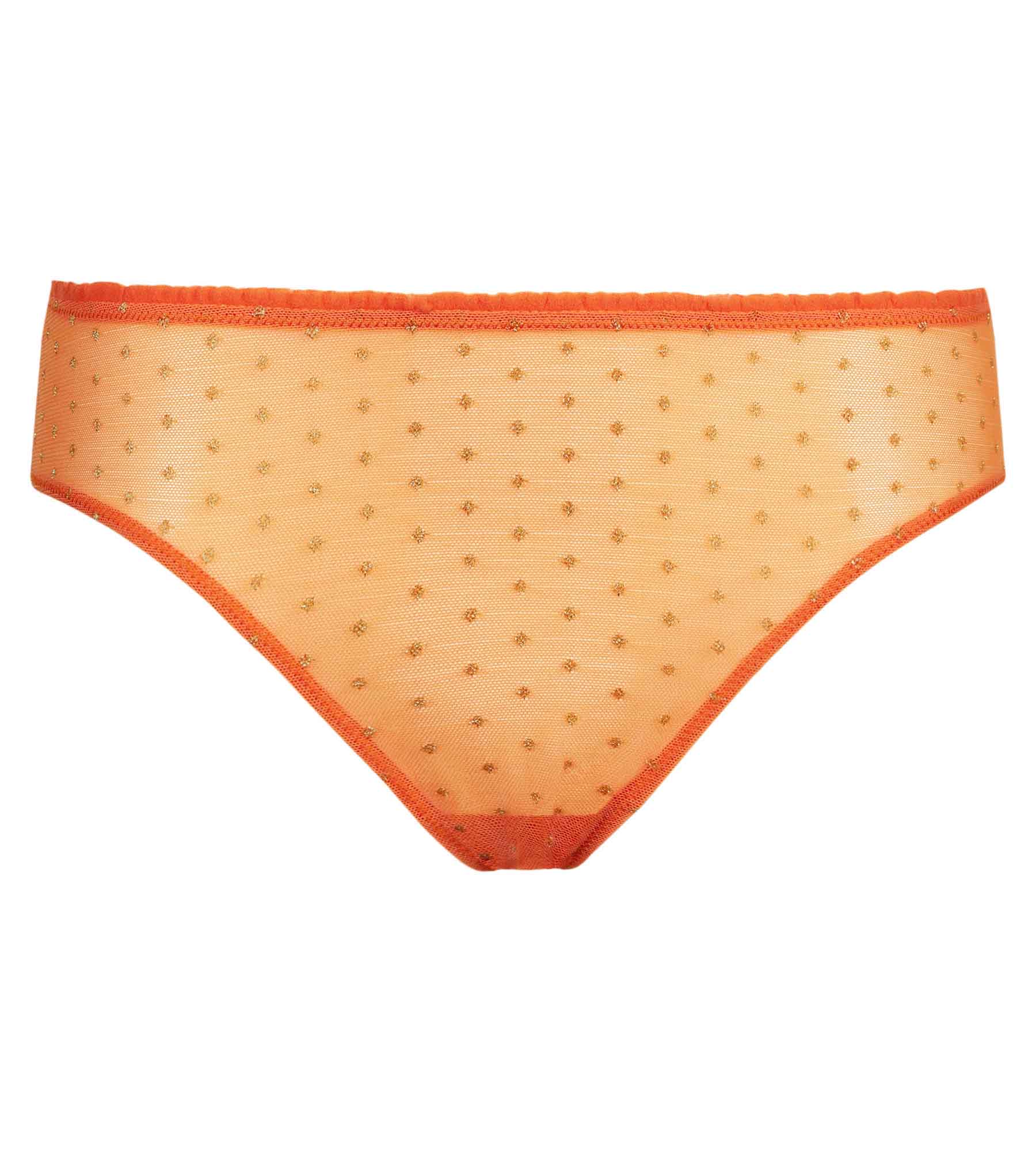 Affichez un look précieux et acidulé grâce à la culotte midi Shiny Mesh de Dim, avec son tulle transparent Orange et ses pois brillants !