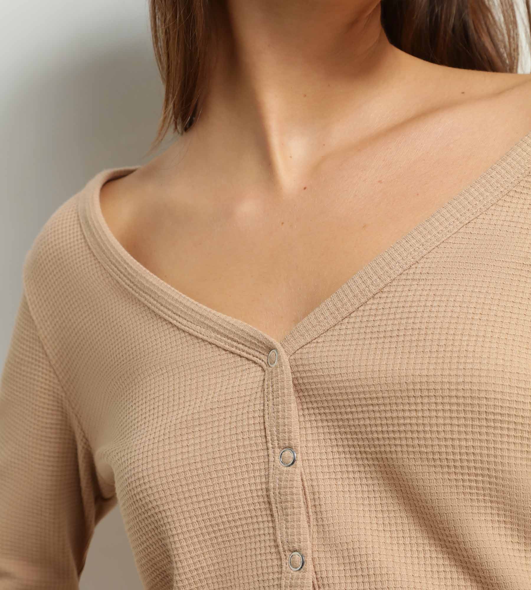 - Le top col V boutonné et le pantalon jogger très casual