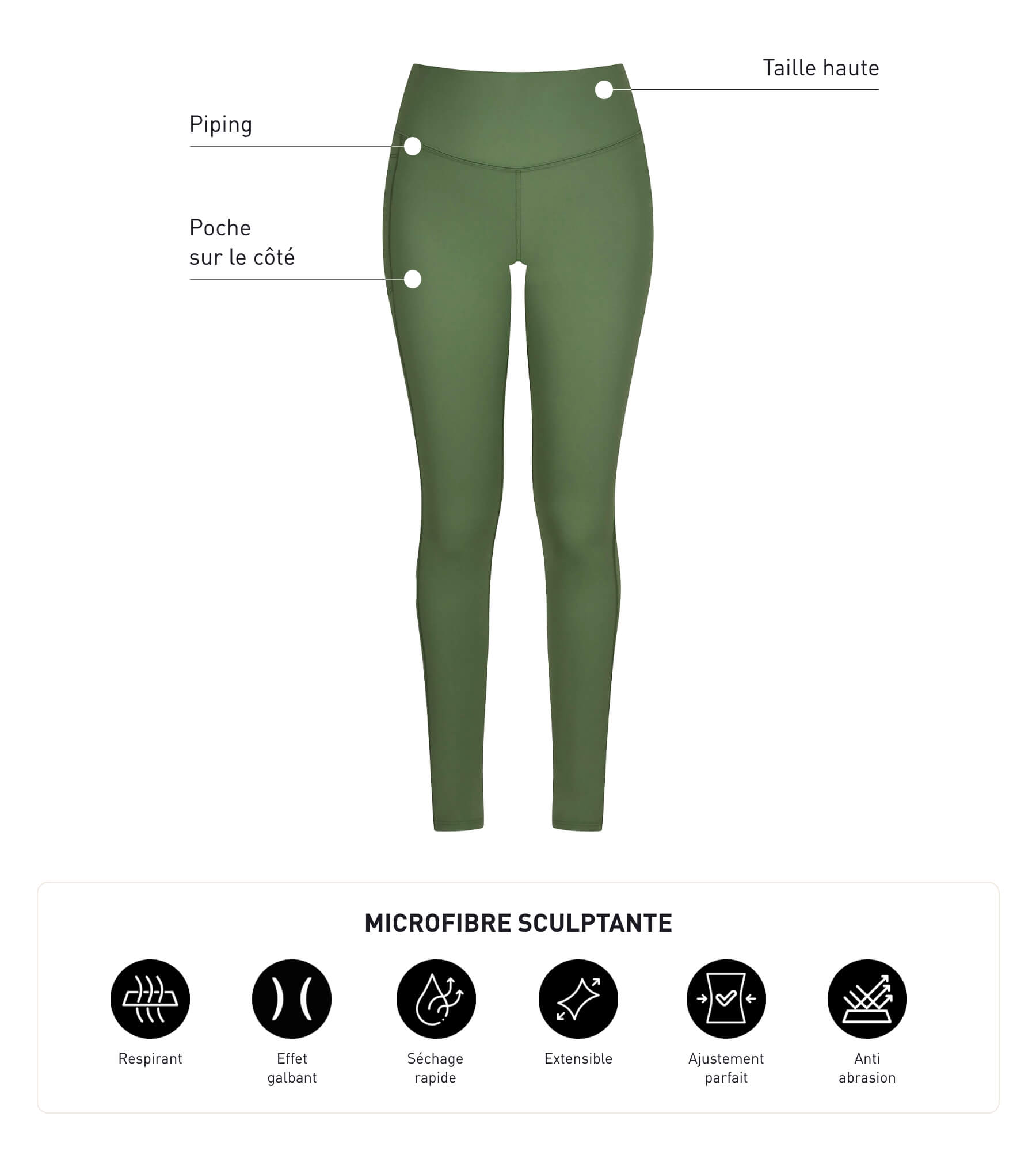 Abordez votre pratique avec aisance, performance et style avec le legging de sport femme en microfibre Kaki Dim Move !