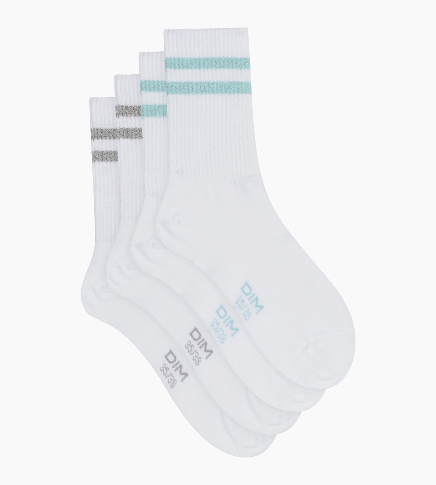 Inspiré du vestiaire sport-chic, le lot de 2 paires de chaussettes femme en coton blanc Dim Mode associe confort actif et reflets métallisés Bleu/Argent.
