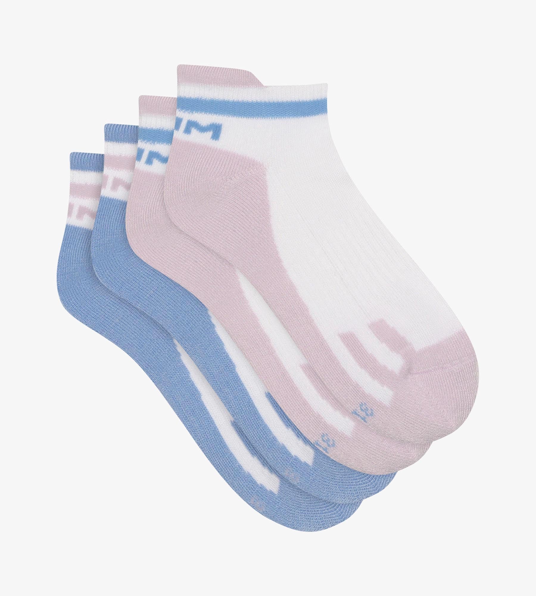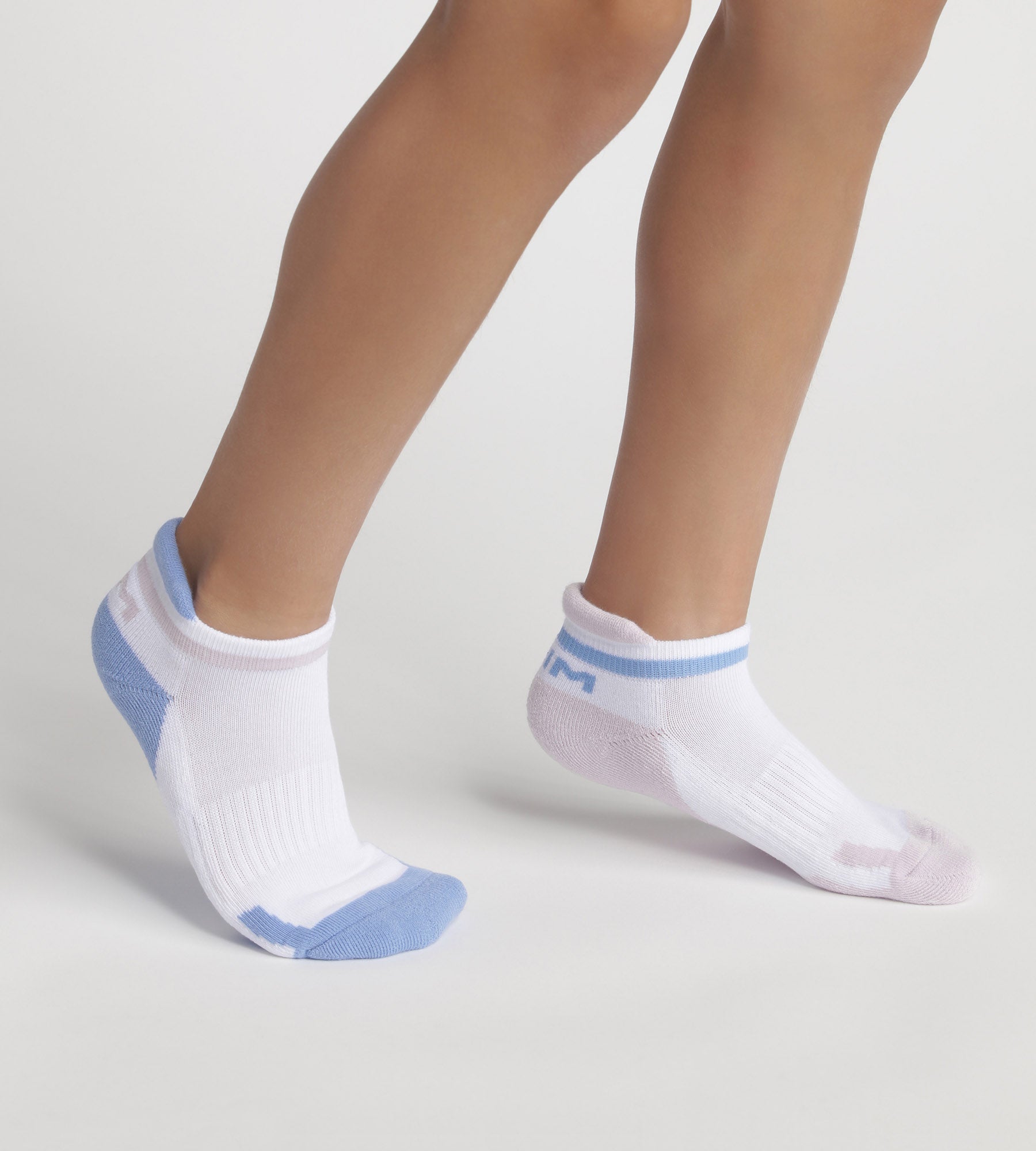 Finalisez vos tenues de sport avec douceur grâce au lot de 2 paires de chaussettes mixtes anti-choc Dim Sport retro Blanc, Lila, Bleu.