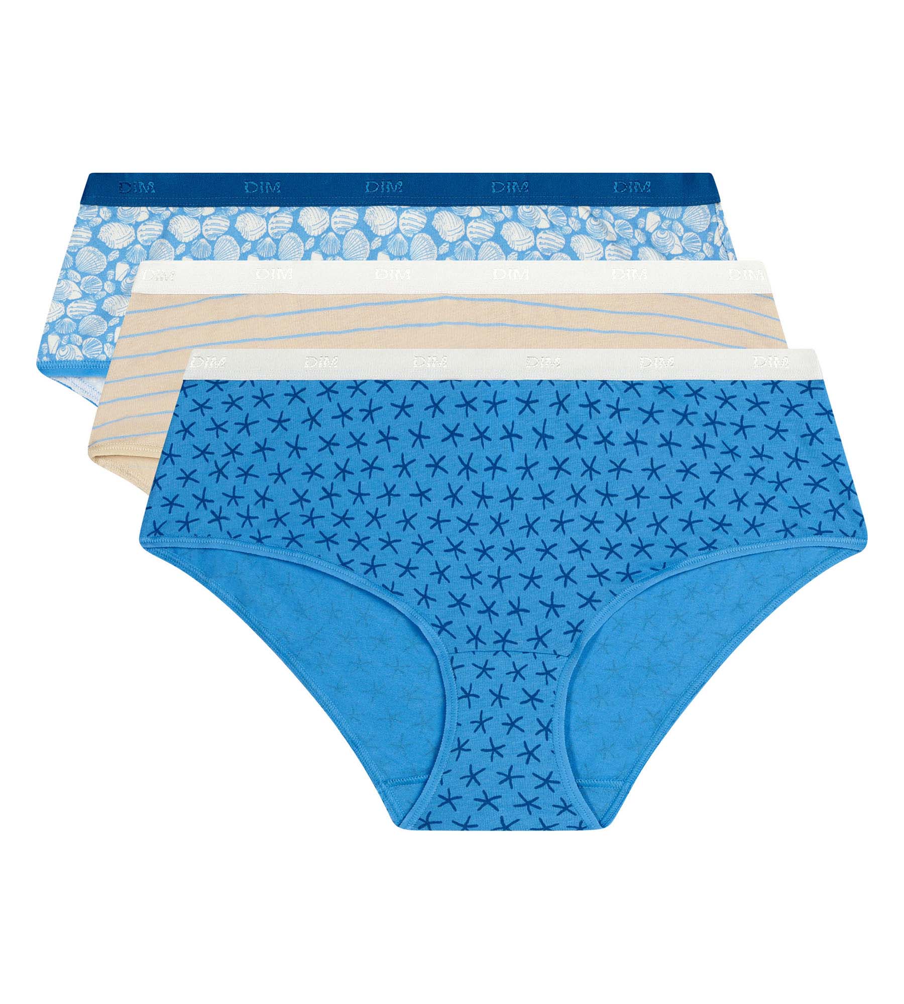 Un air de vacances avec le lot de 3 boxers femme Les Pockets de Dim, en coton stretch bleu, beige et motifs qui rappellent les beaux jours.