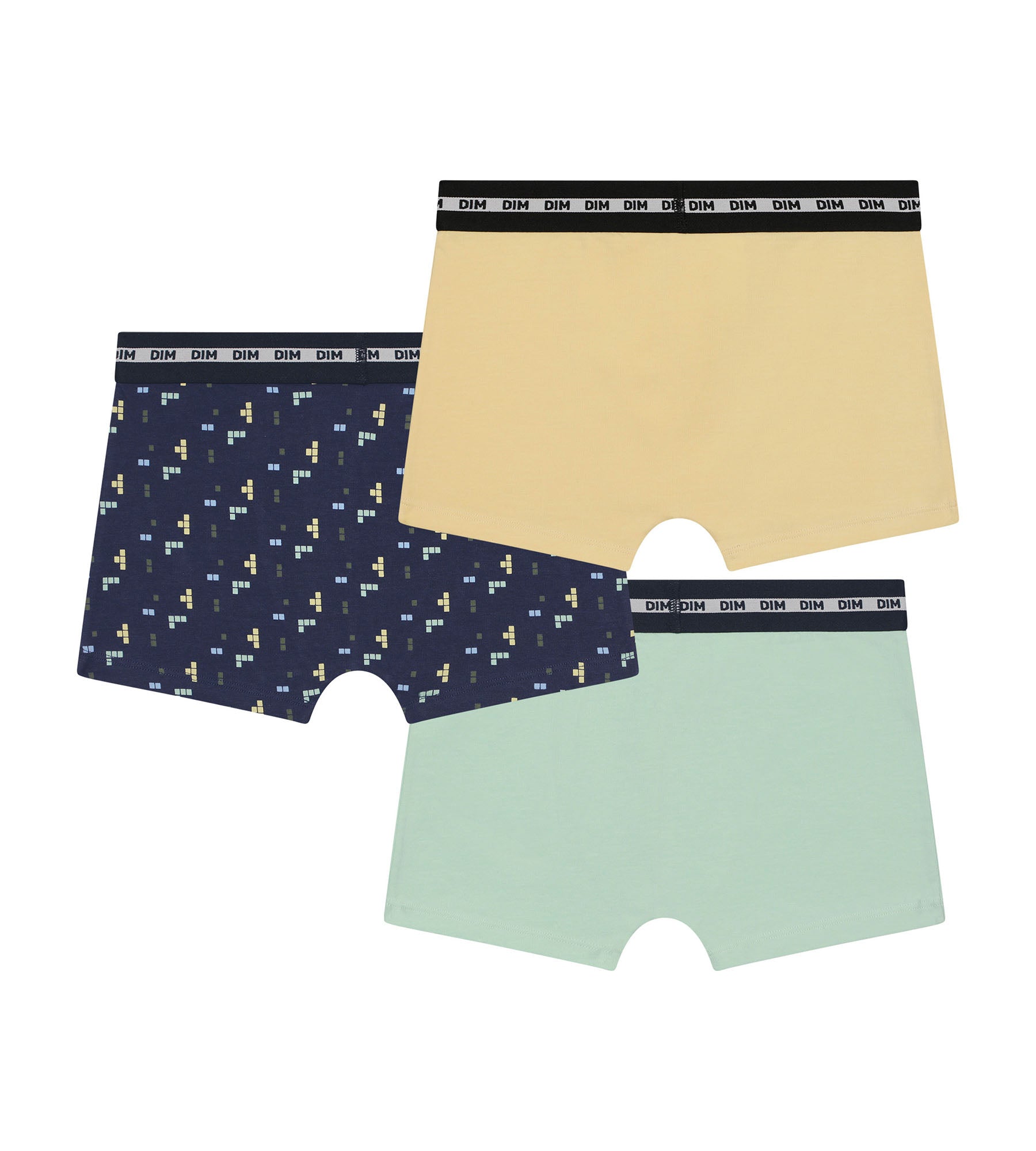 Votre ado adopte un look frais et insolite avec le lot de 3 boxers enfant en coton stretch marine, jaune et vert Dim Mode à l’imprimé gaming !