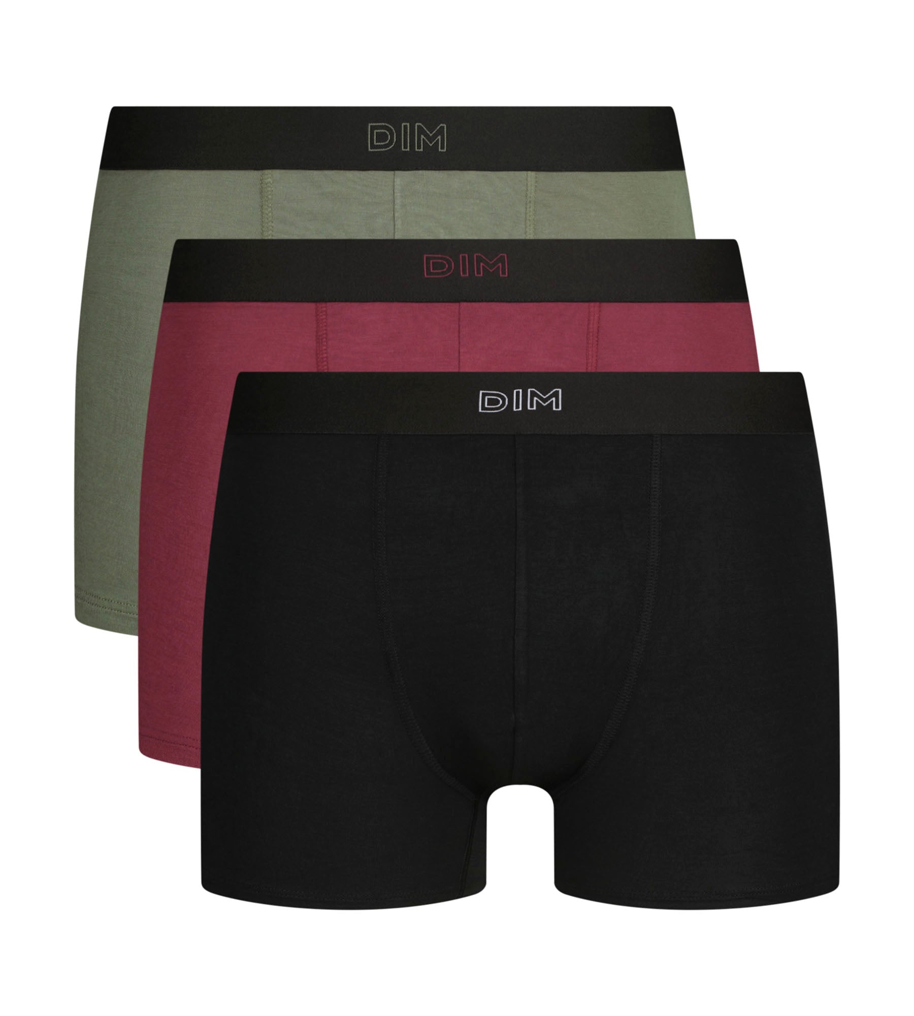 Renforcez votre confort quotidien avec le lot de 3 boxers homme Dim Pur Confort en Noir, Kaki et Rouge, des essentiels qui allient maintien et style.