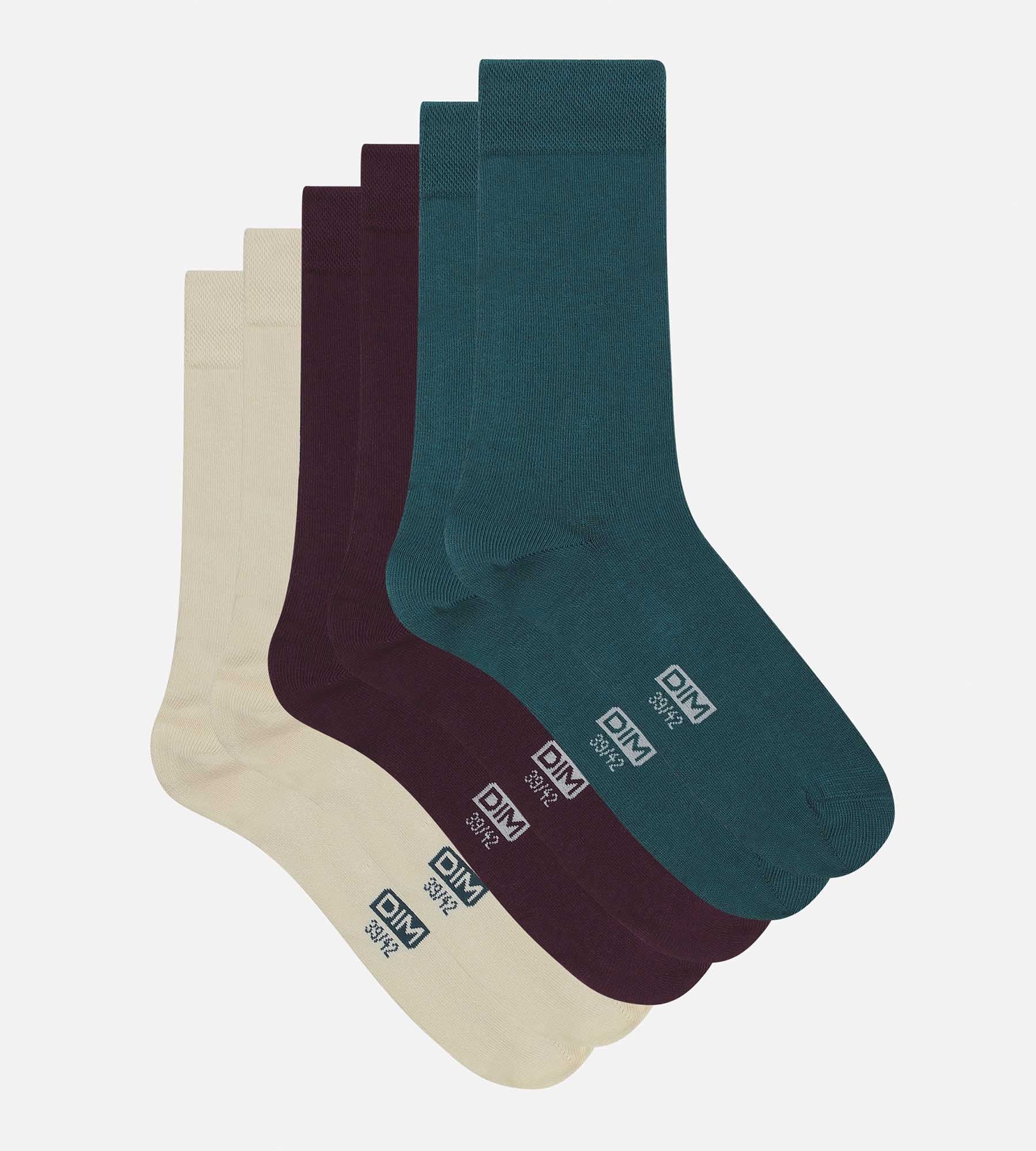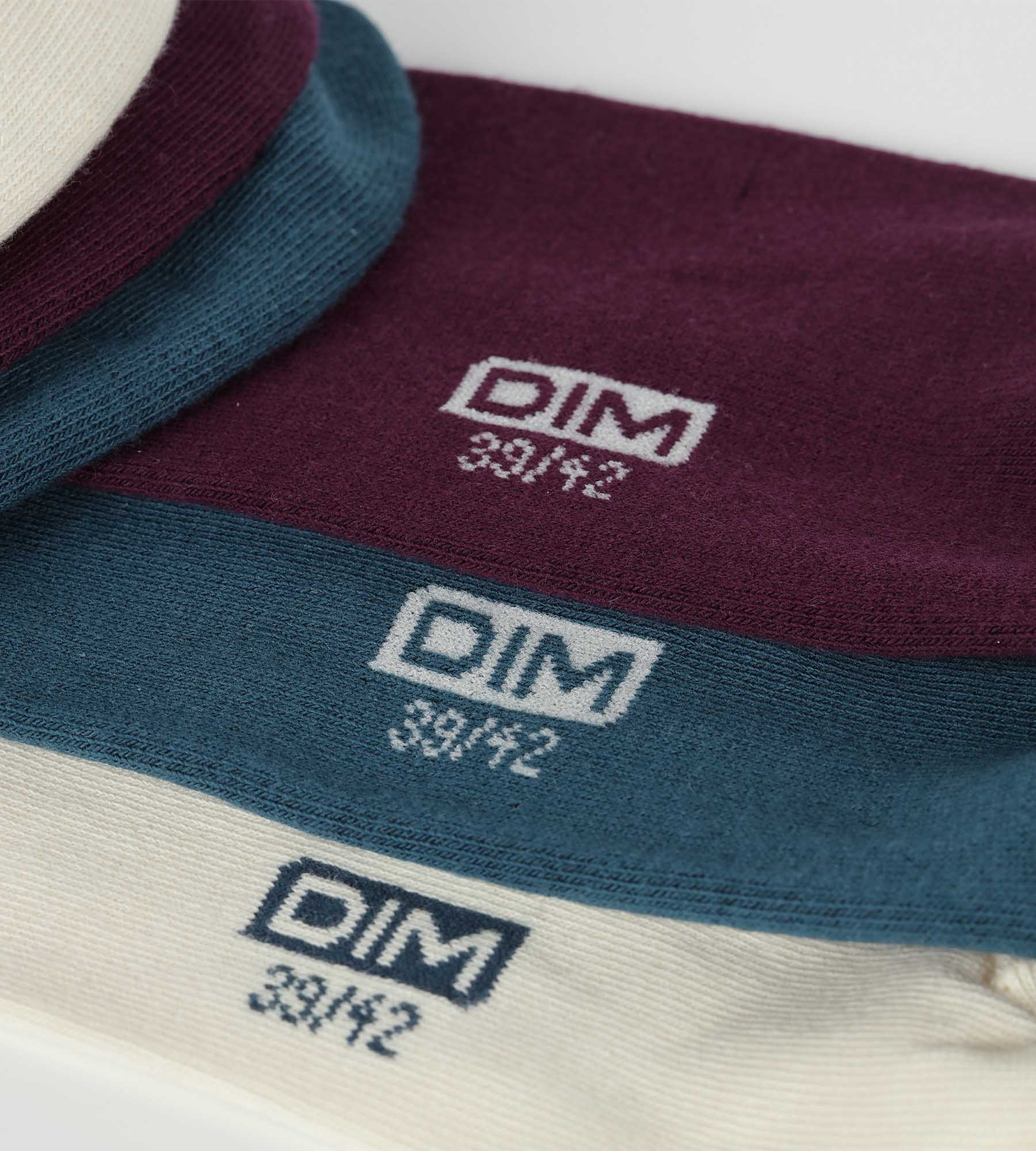 Optez pour un look élégant et confortable avec le lot de 3 paires de chaussettes homme Dim en coton bleu canard, violet et crème !