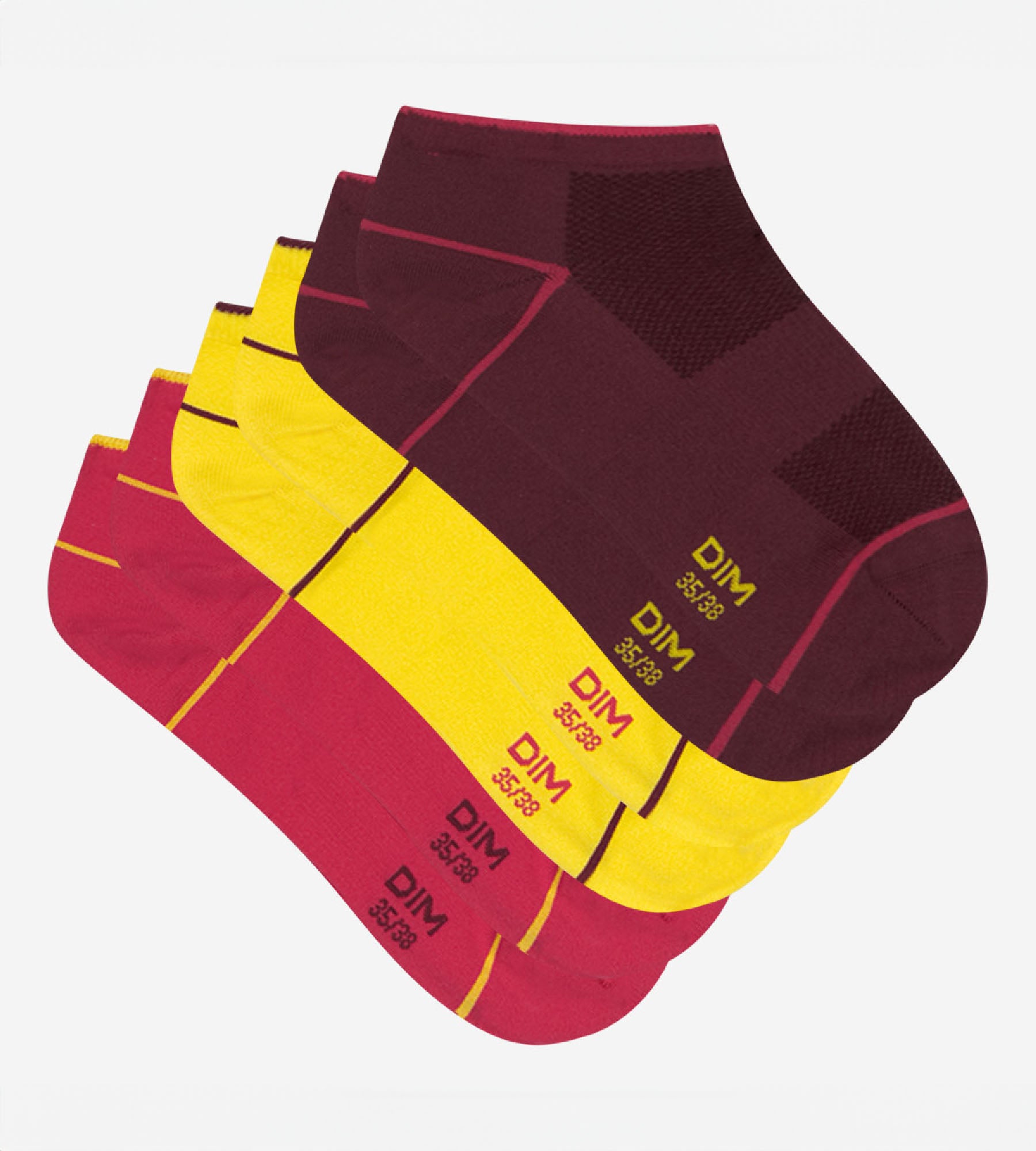 Égayez votre séance de yoga avec notre lot de 3 paires de chaussettes basses femme impact léger Dim Sport au maillage thermorégulateur ultra pop !