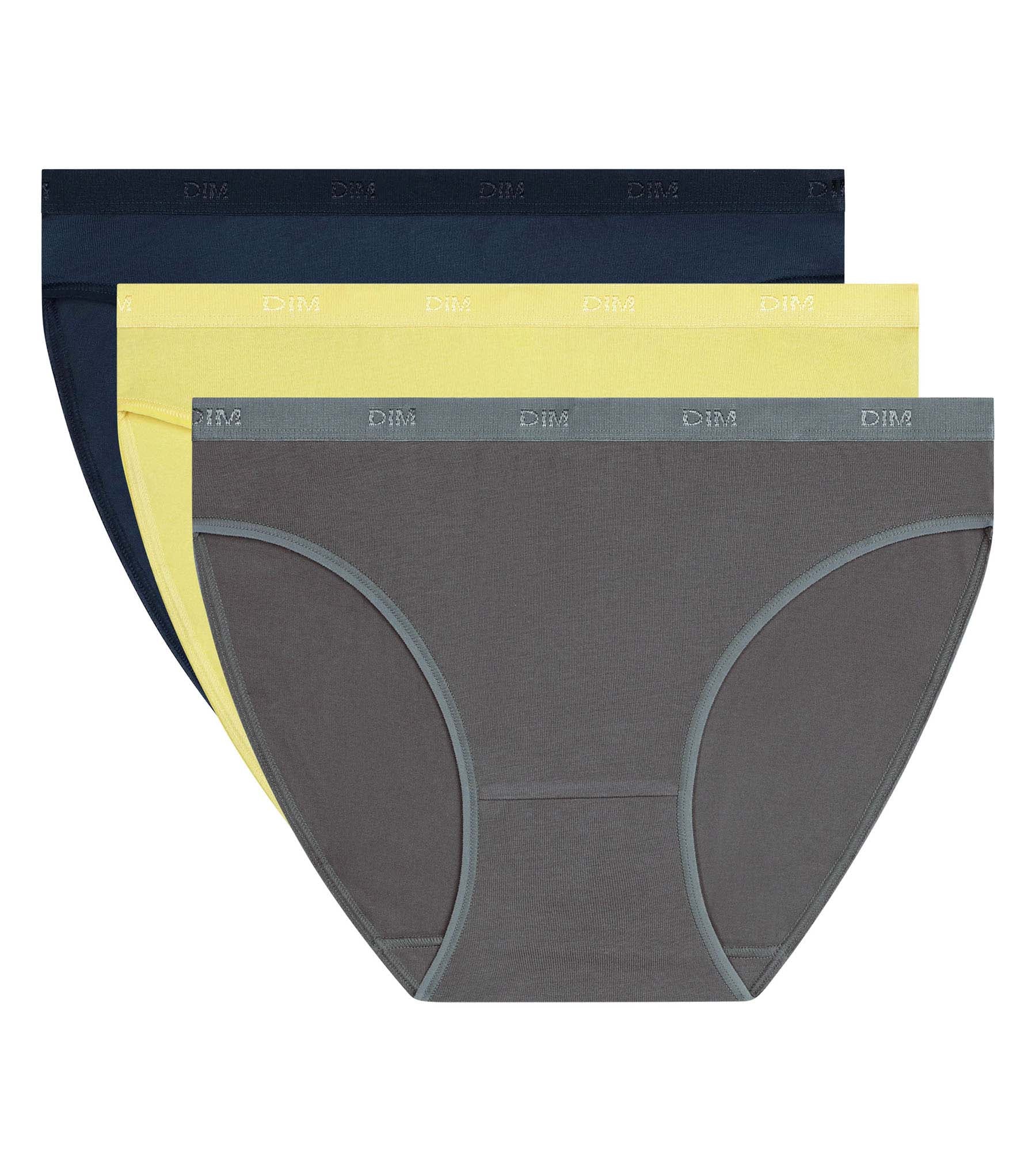 Apportez une touche de fraîcheur à votre quotidien avec ce lot de 3 slips femme en coton stretch Les Pockets Ecodim aux coloris Bleu, Gris, Jaune.
