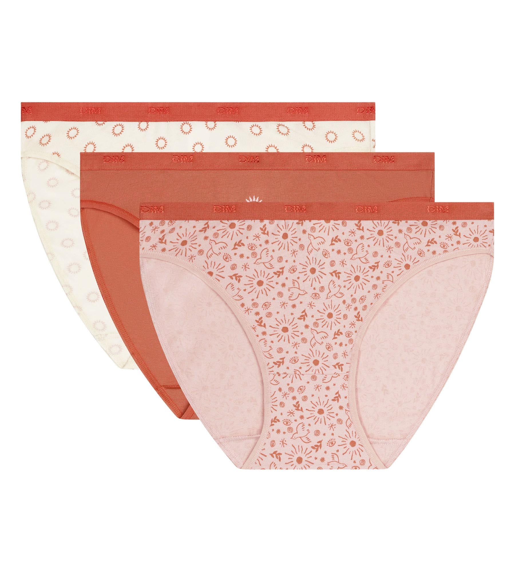 Réveillez votre tiroir lingerie avec le lot de 3 culottes femme Les Pockets de Dim en coton stretch et imprimés Soleil.