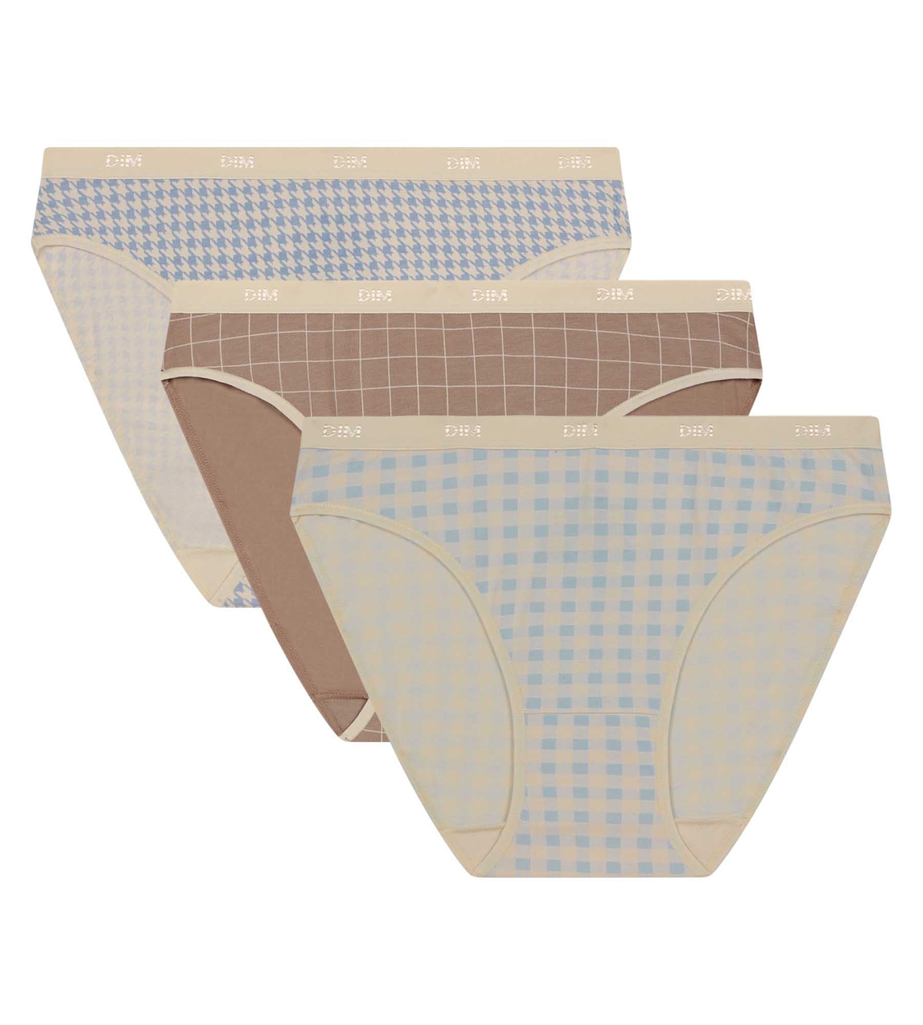 Ce lot de culottes coton femme Dim Les Pockets mise sur un style affirmé avec trois modèles à motifs forts et couleurs douces. Il est composé de 3 slips femme aux imprimés rétro : un modèle à carreaux vichy bleu ciel et écru, une culotte femme café au motif quadrillé fin, et un slip femme pied-de-poule bleu denim. Leur matière douce et extensible garantit un bon maintien tout en légèreté et s’adapte à toutes les morphologies, sans compression.