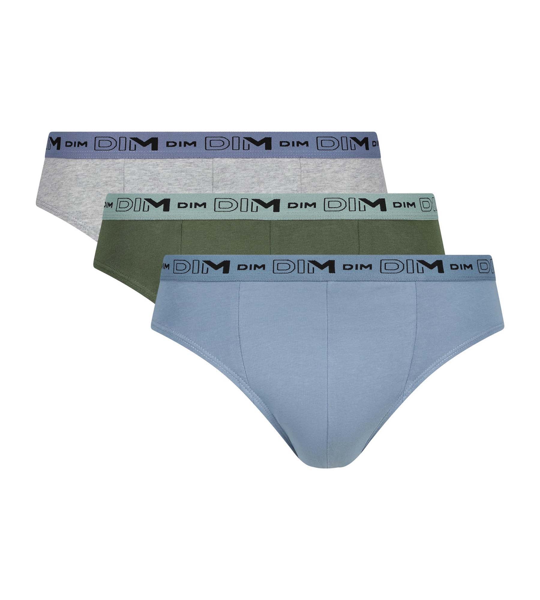 Misez sur un confort naturel et discret avec ce lot de 3 slips homme Dim Coton Stretch Bio, en Bleu, Gris et Kaki !