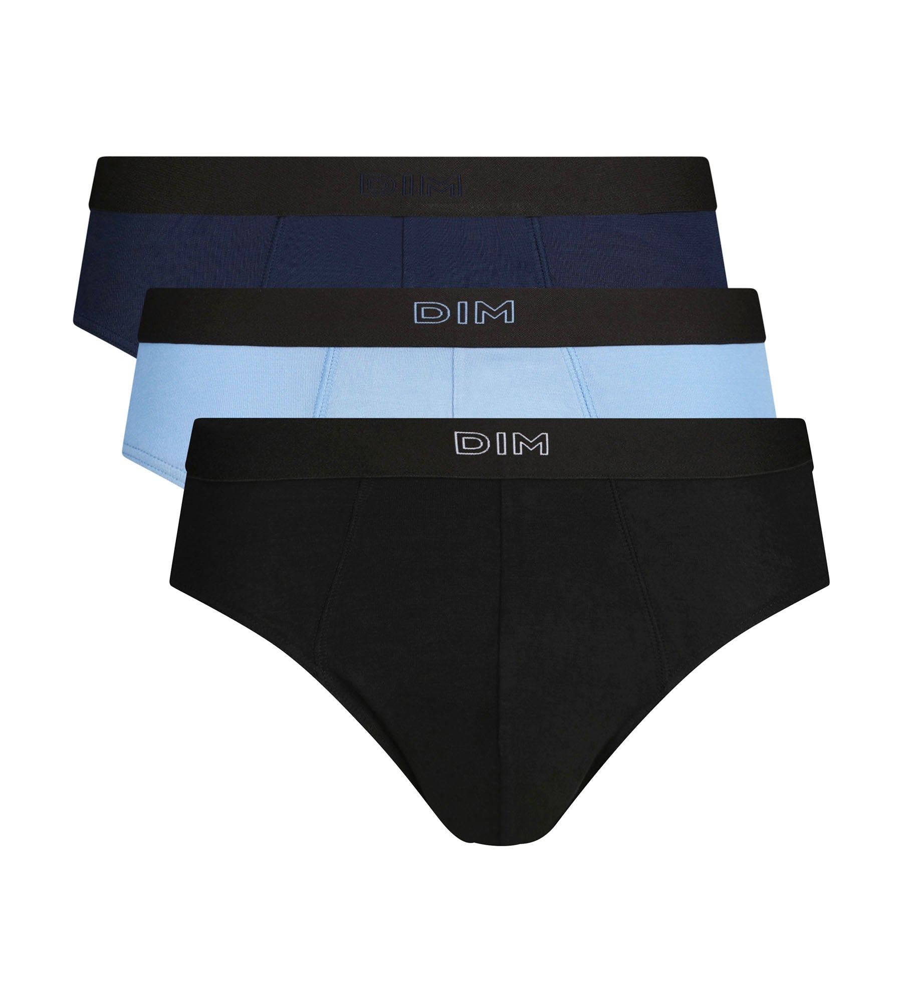 Optez pour ce lot de 3 slips homme Dim Pur Confort en coton viscose Noir, Navy et Bleu, des basiques colorés qui simplifient le quotidien !
