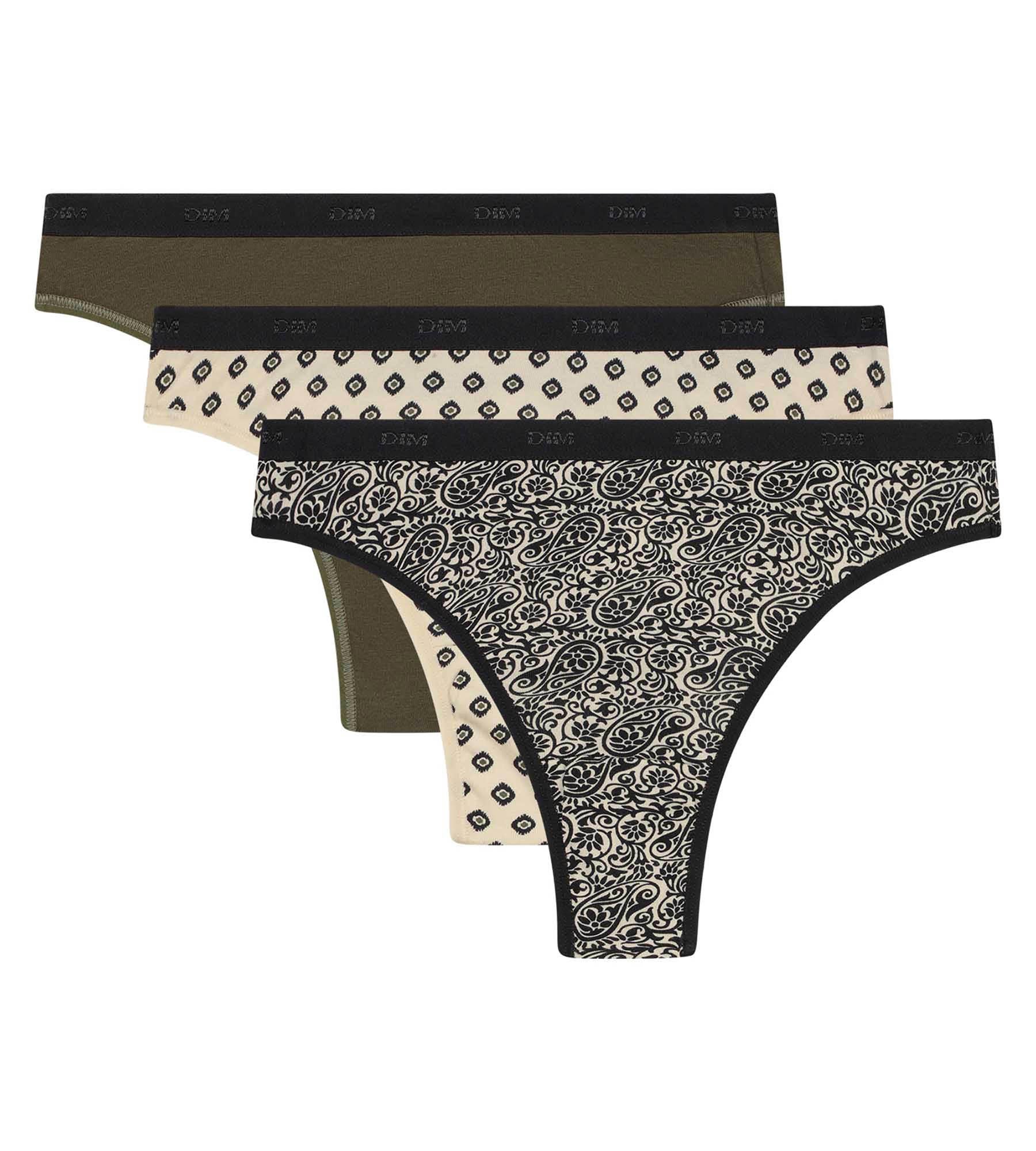 Ce lot de 3 strings femme de la gamme Dim Les Pockets est parfait pour renouveler ses basiques avec style. Entre le modèle noir à imprimé cachemire, le string beige à motifs géométriques noirs et le modèle uni kaki, chaque pièce apporte sa dose de caractère. Grâce à leur coupe invisible et leur matière extensible en coton, ces strings pour femmes se glissent facilement sous tous vos bas, avec aisance.