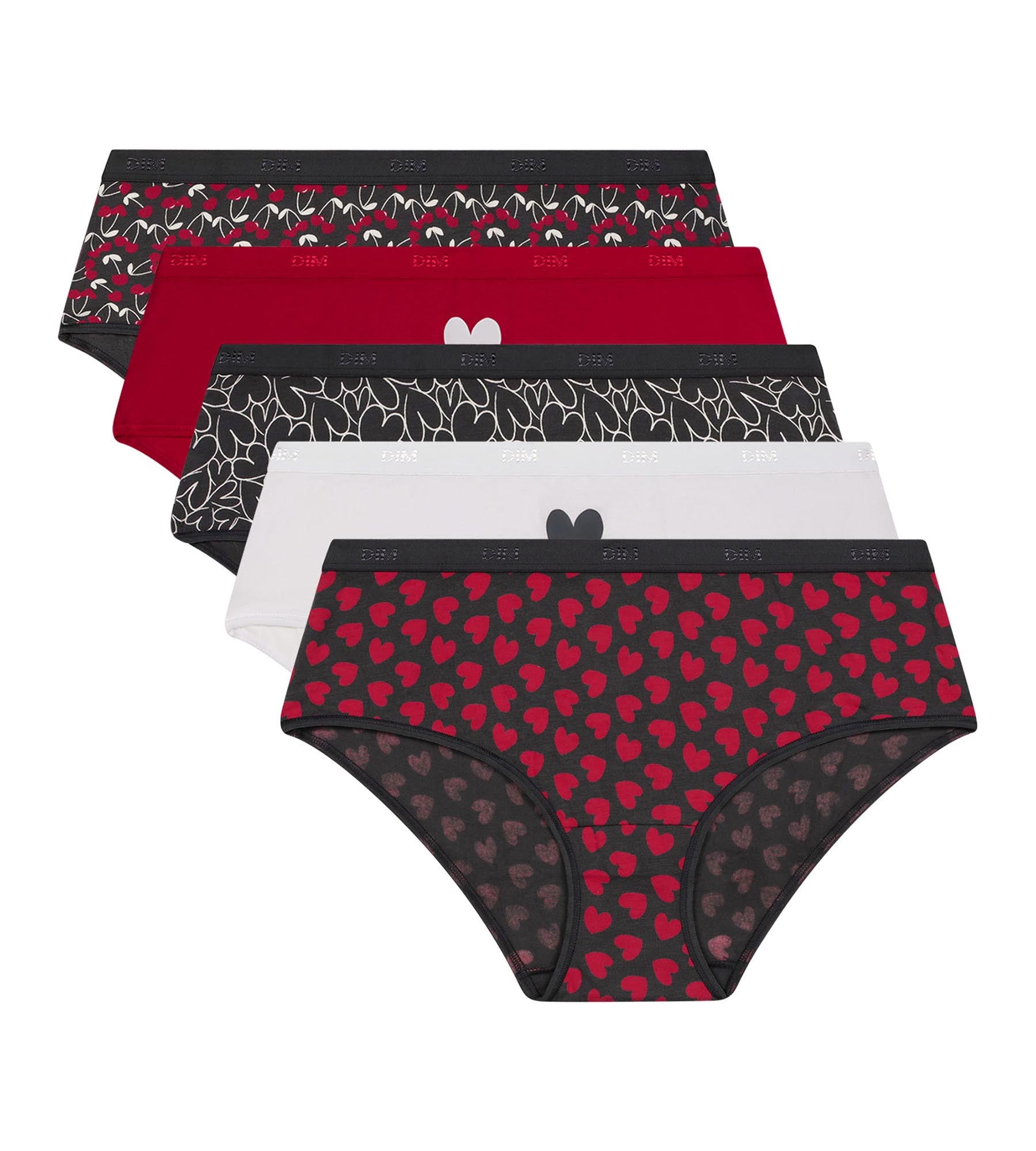 Lot de 5 shorties femme coton stretch Rouge motifs coeurs Les Pockets