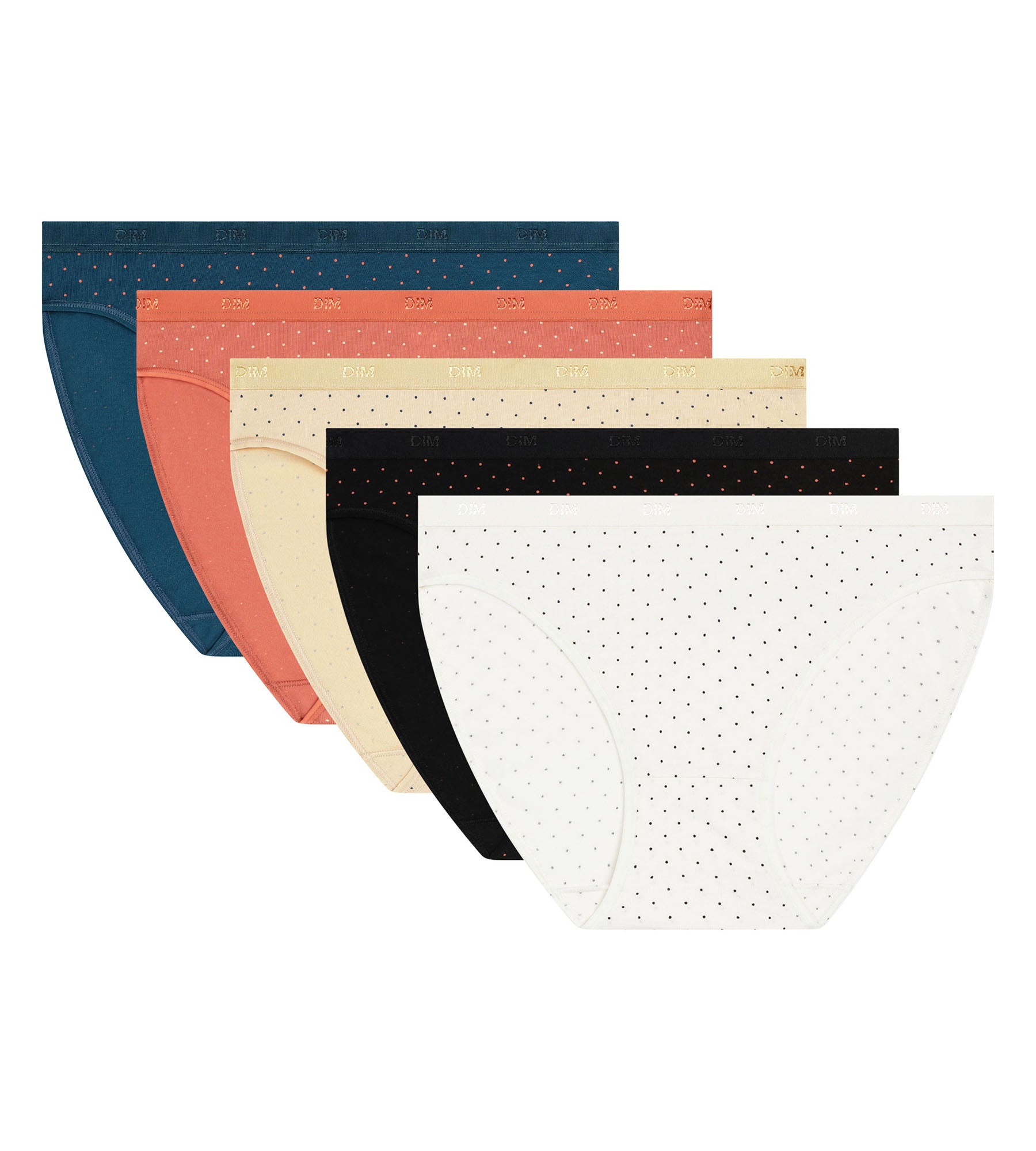 Adoptez un look rétro avec ce lot de 5 culottes femme Dim Les Pockets en coton stretch, forme classique, au motif à pois plein de pep’s.