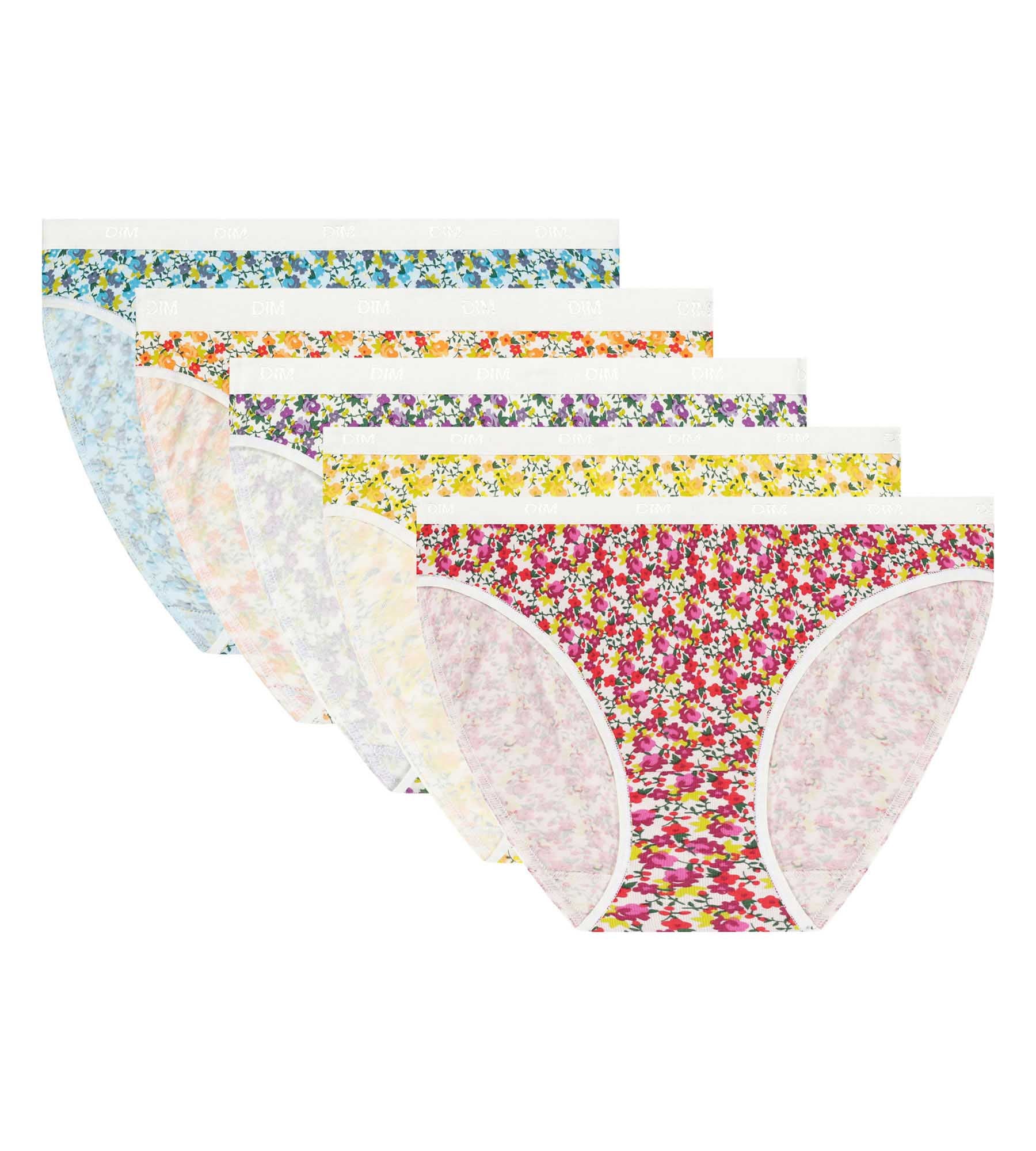 Ajoutez une touche de fantaisie à votre quotidien avec le lot de 5 culottes femme Les Pockets de Dim en coton stretch et imprimés floraux.