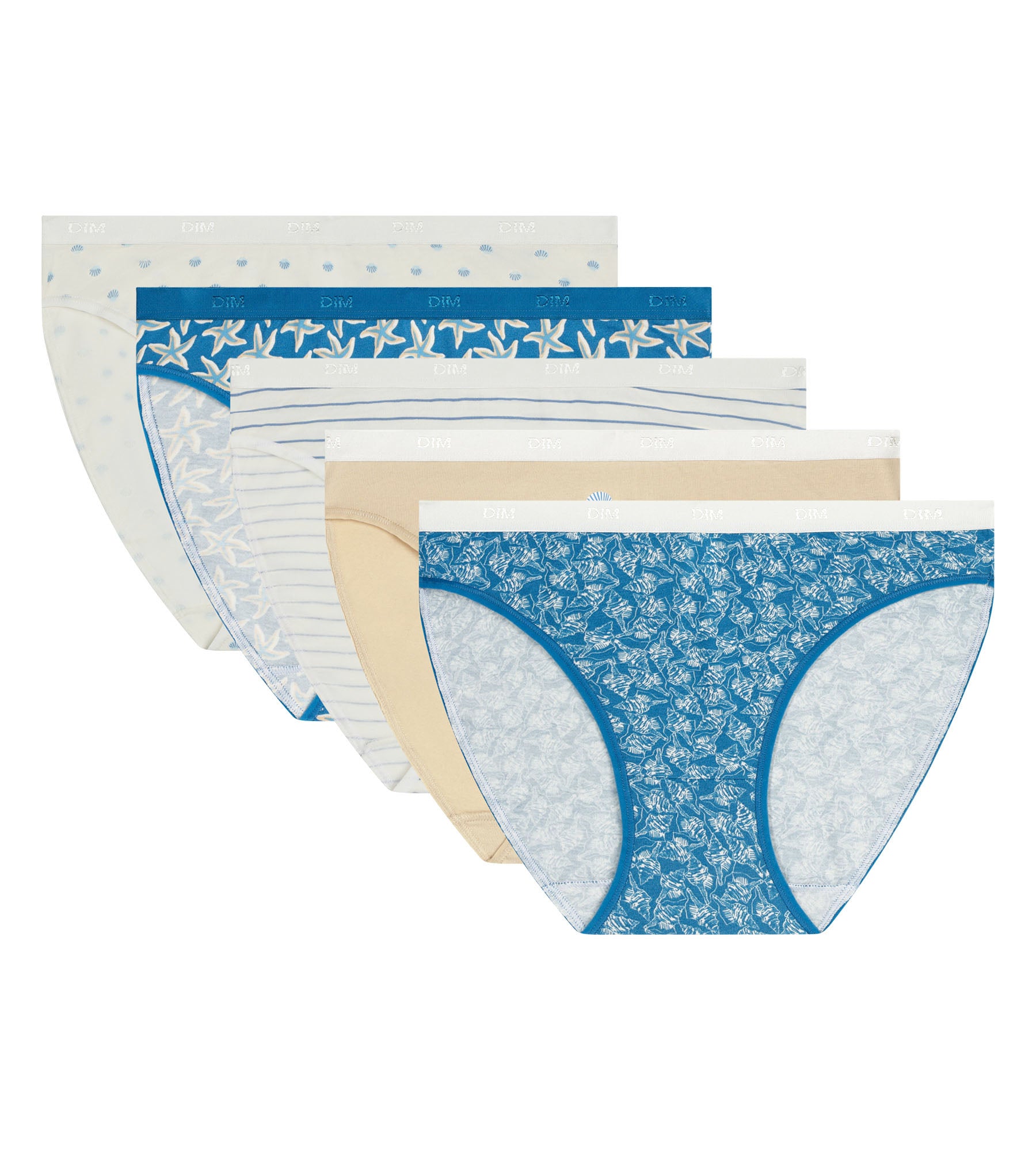 Adoptez le style sailor chic avec le lot de 5 culottes femme Les Pockets de Dim en coton stretch et motifs azurés.