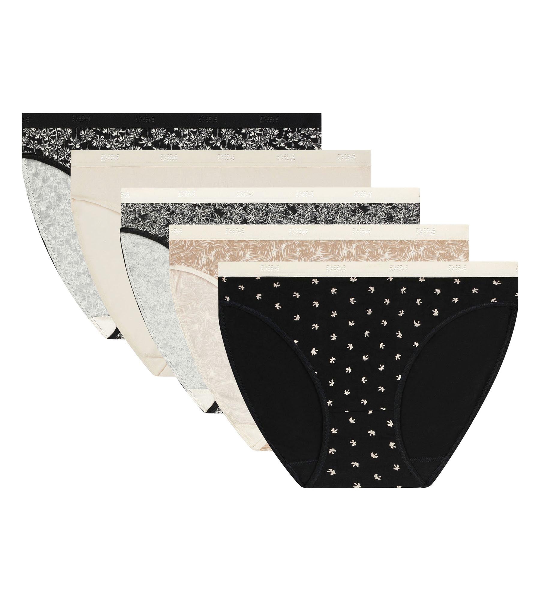 Mode évasion activé avec le lot de 5 culottes femme Les Pockets de Dim en coton stretch, aux motifs exotiques sobres.