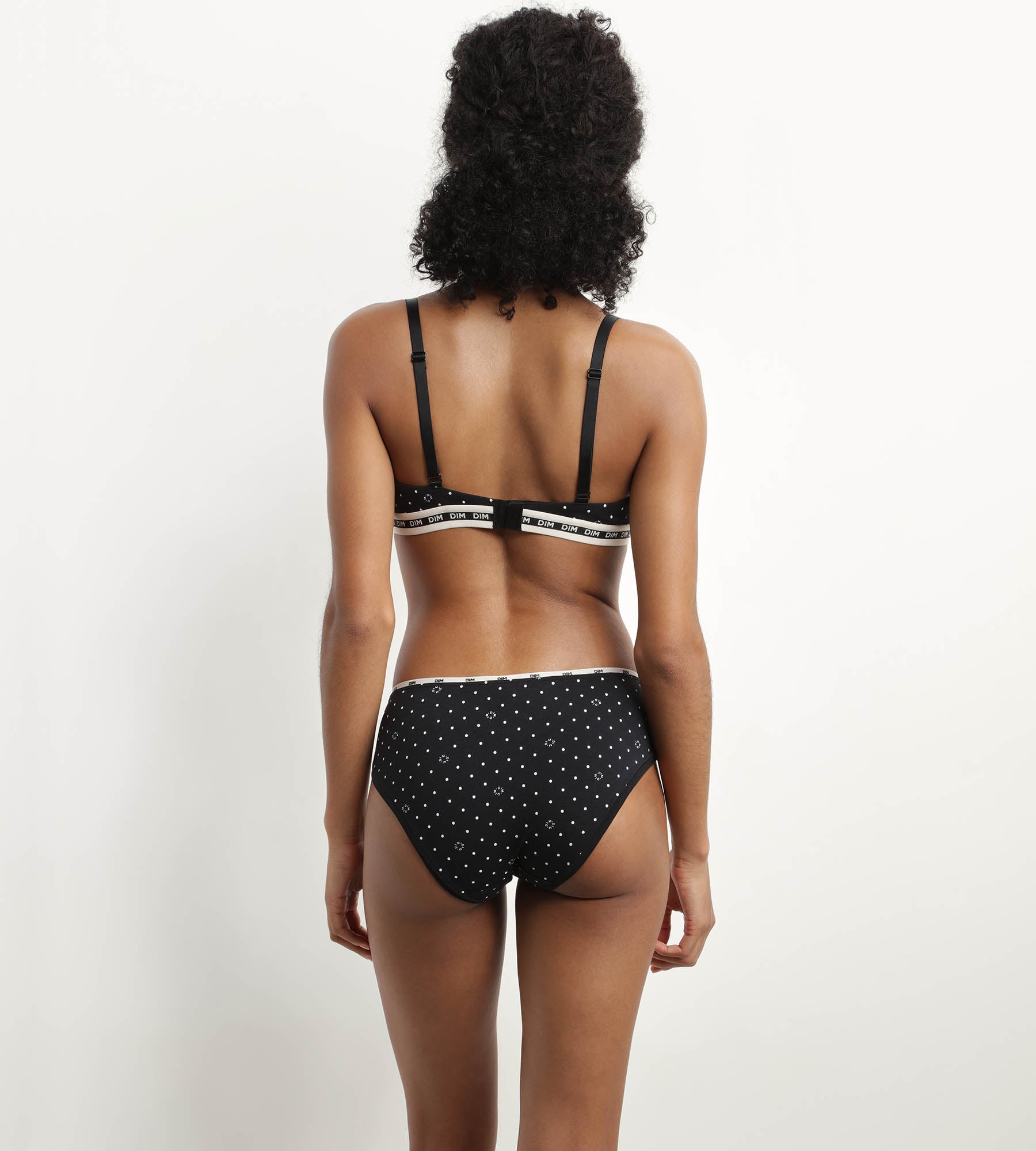 Adoptez le look pin-up avec brio grâce à notre culotte noire Dim Icons Essentiel au corps en coton modal recouvert de pois et logos Dim contrastés, très trendy ! Construite avec des bords plats et avec une bande de maintien non marquée, votre culotte coton est absolument confortable !