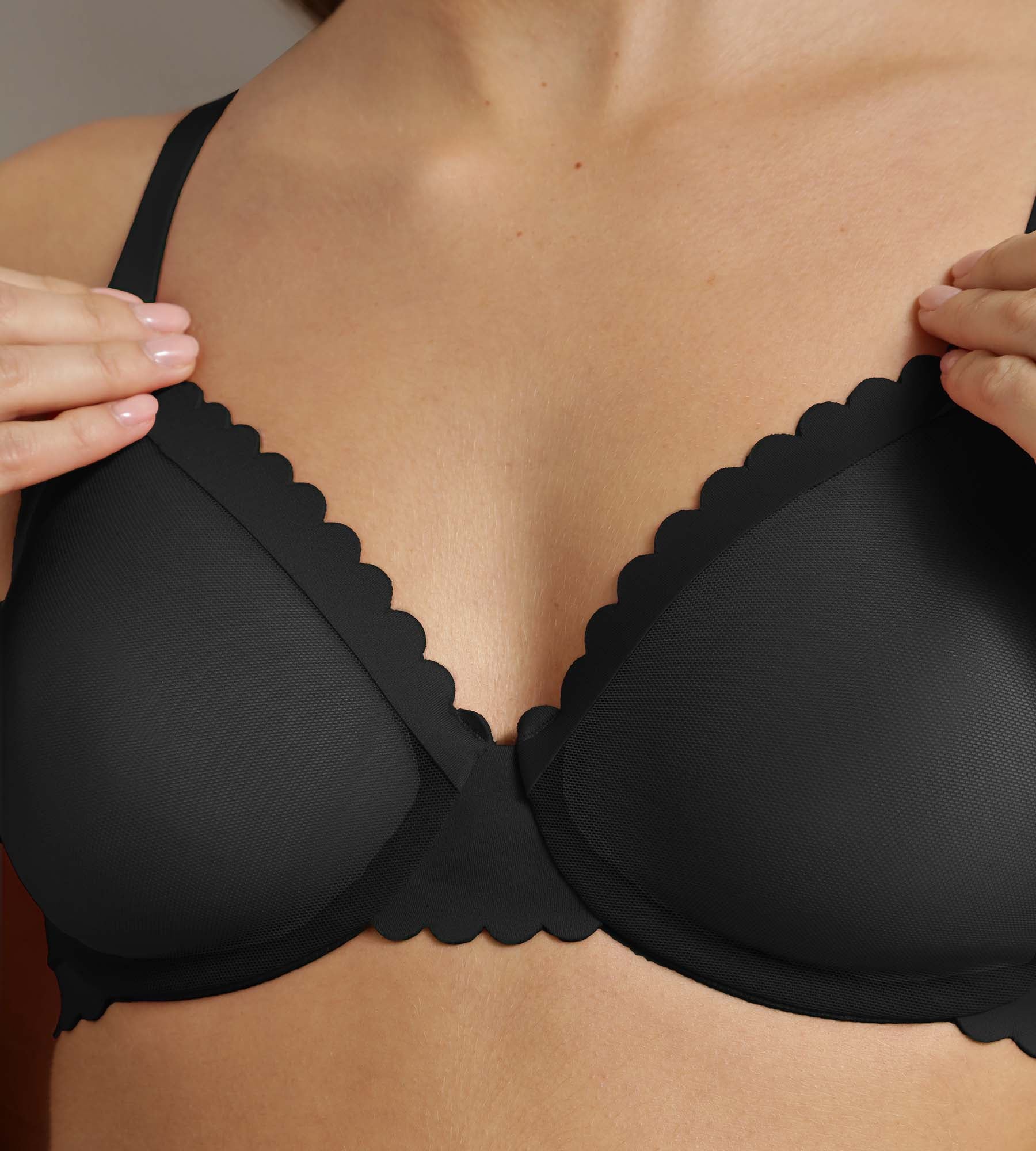 Avec son tulle noir transparent et ses finitions seconde peau, le soutien-gorge corbeille Dim Body Touch Cheeky structure la silhouette tout en restant invisible.