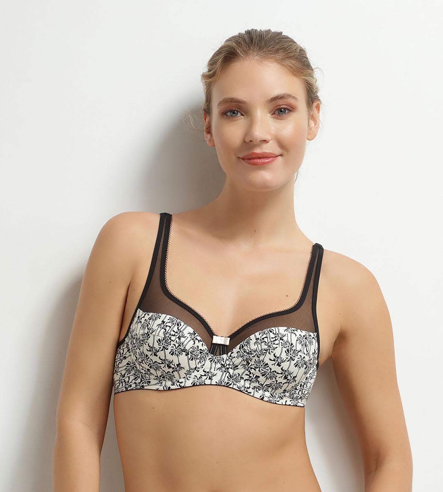 Cap sur l’exotisme avec le soutien-gorge emboîtant Dim Generous en tulle et microfibre à motif Palmiers Crème et Noir !