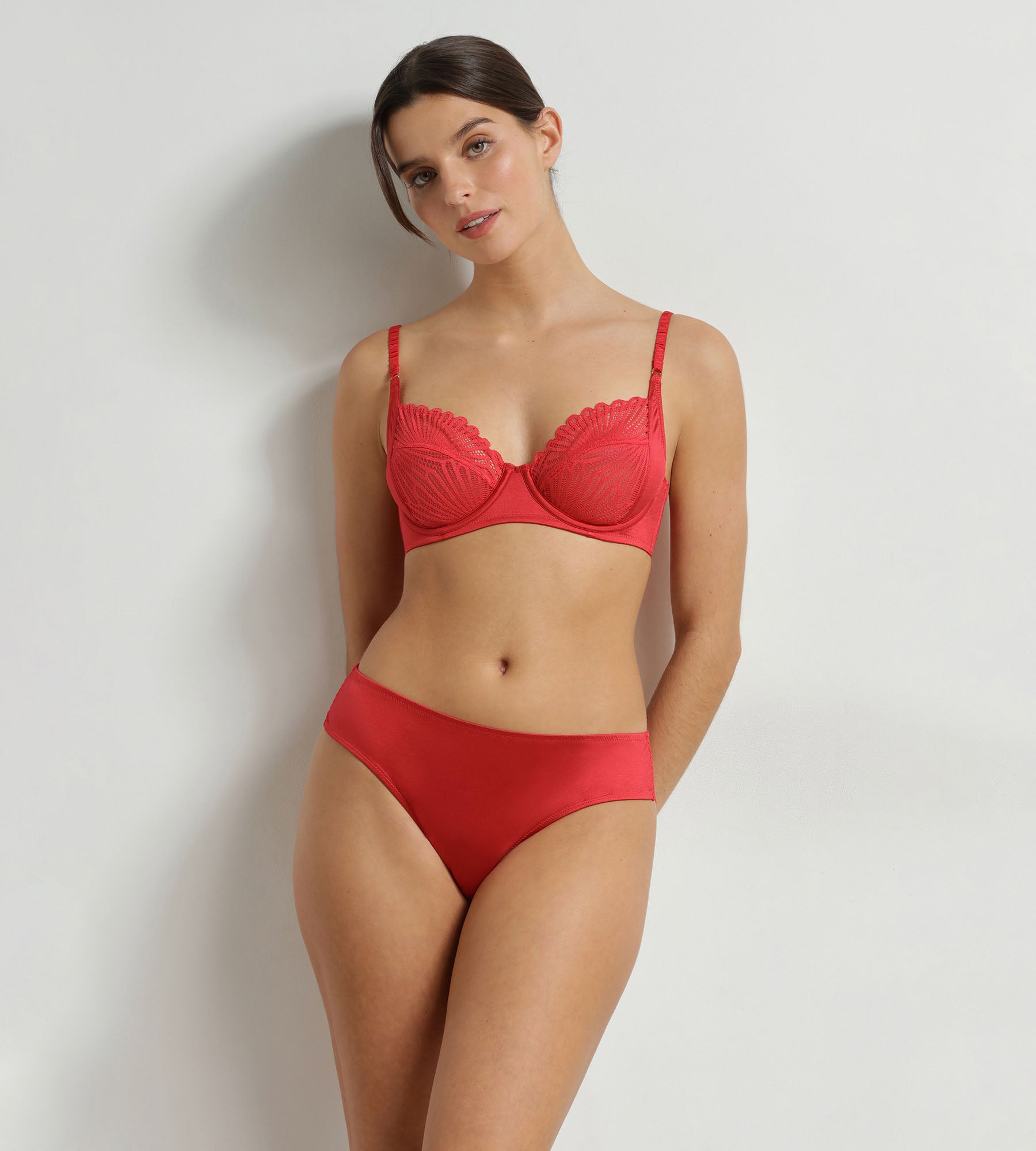 Avec sa dentelle délicate et son satin lumineux, le soutien-gorge Dim Chocolove rouge à armatures allie maintien et sensualité dans une coupe emboîtante élégante.